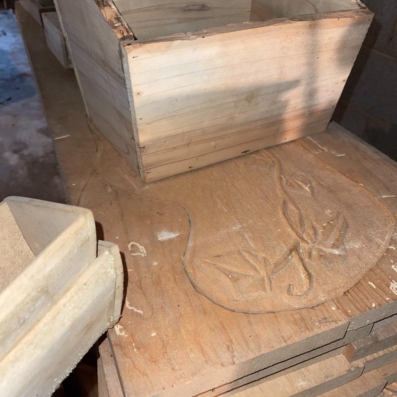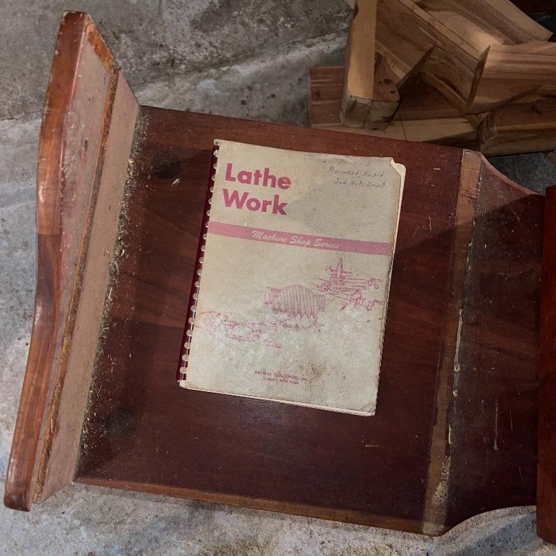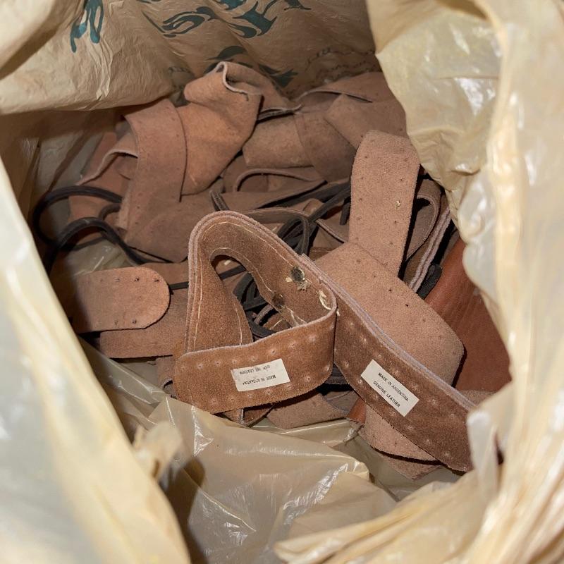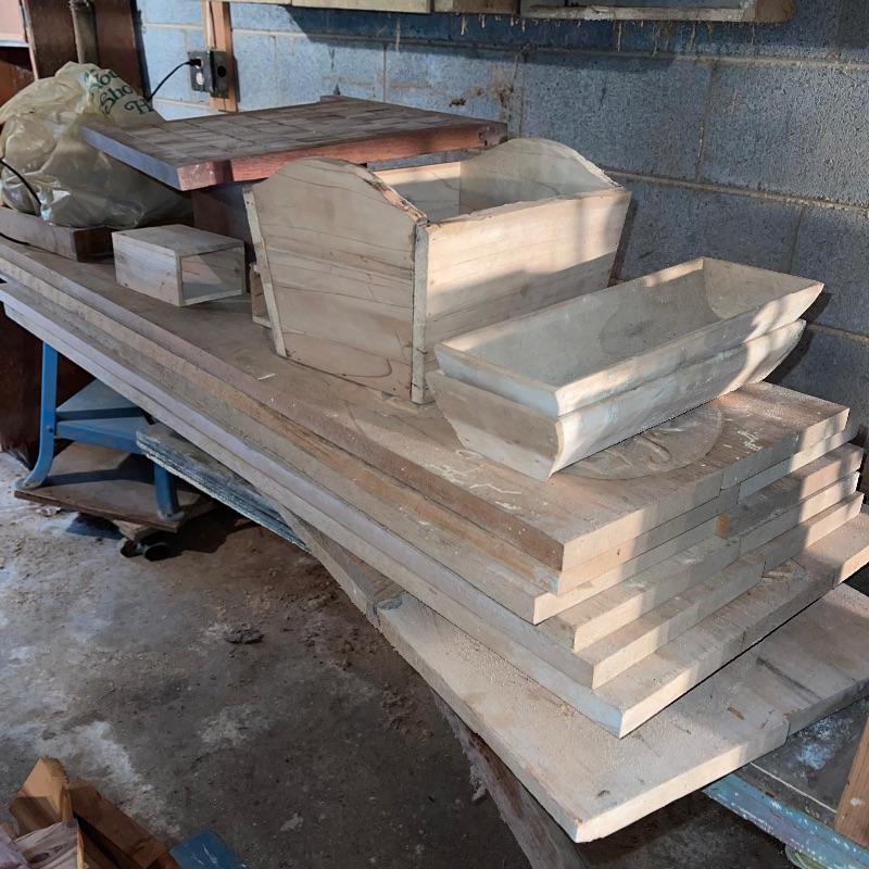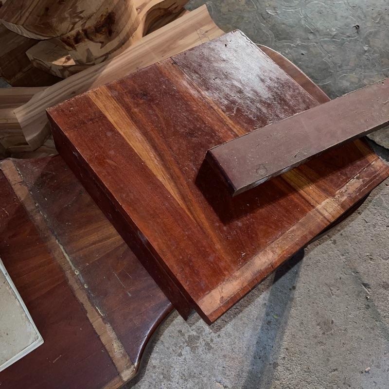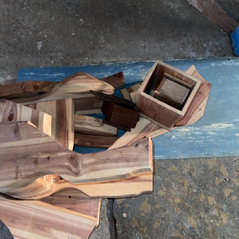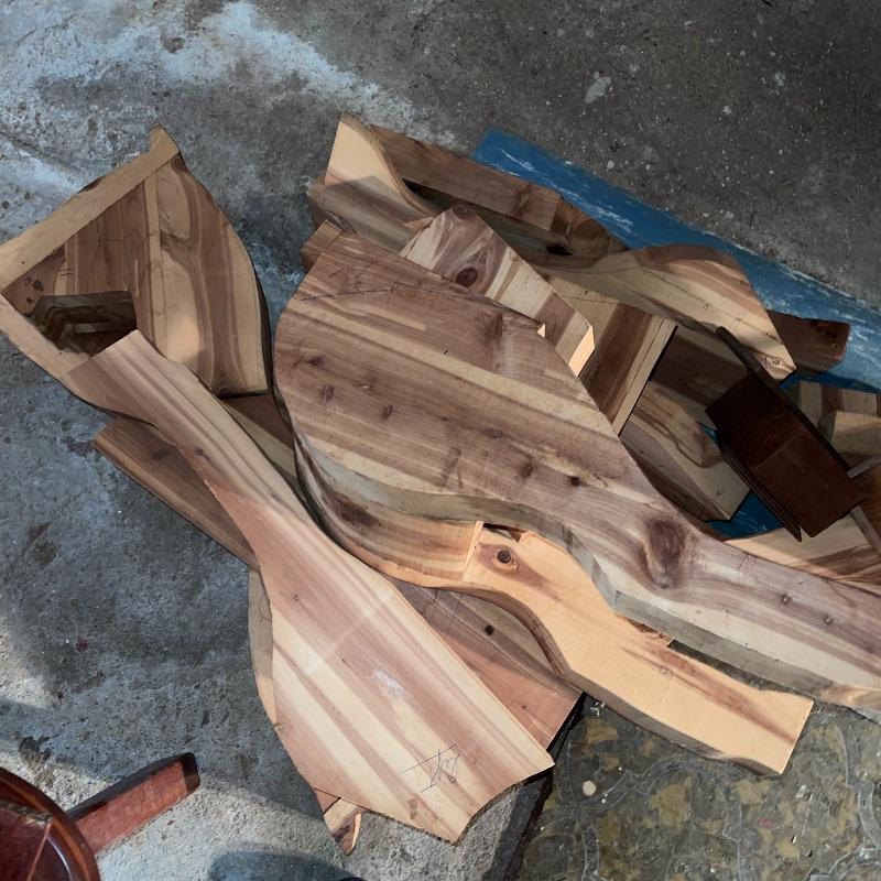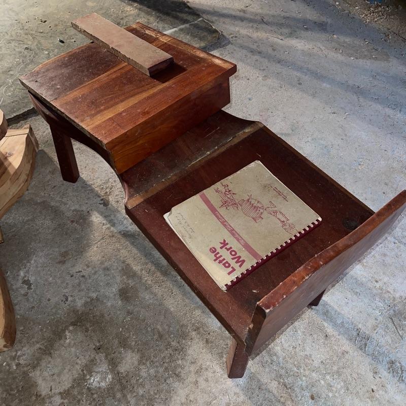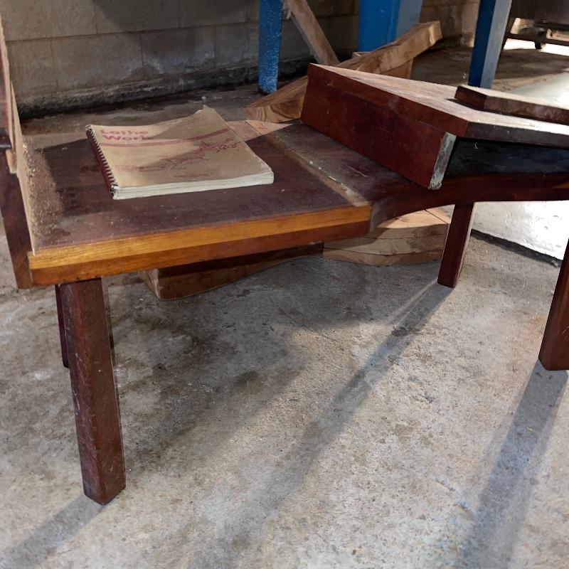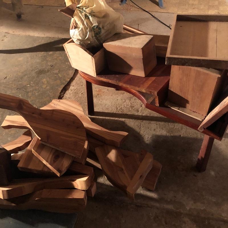 Collection of scrap wood, wooden table/bench, leather, and more. Table/bench measures 36” x 16” x 23”. Some of the wood look as if they are pieces to a standing and rocking horse. Local pickup only.