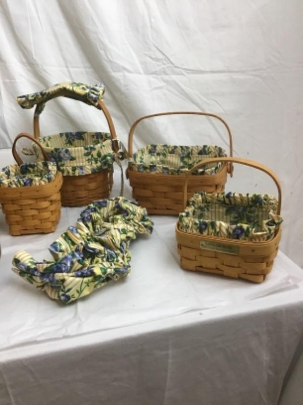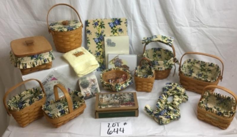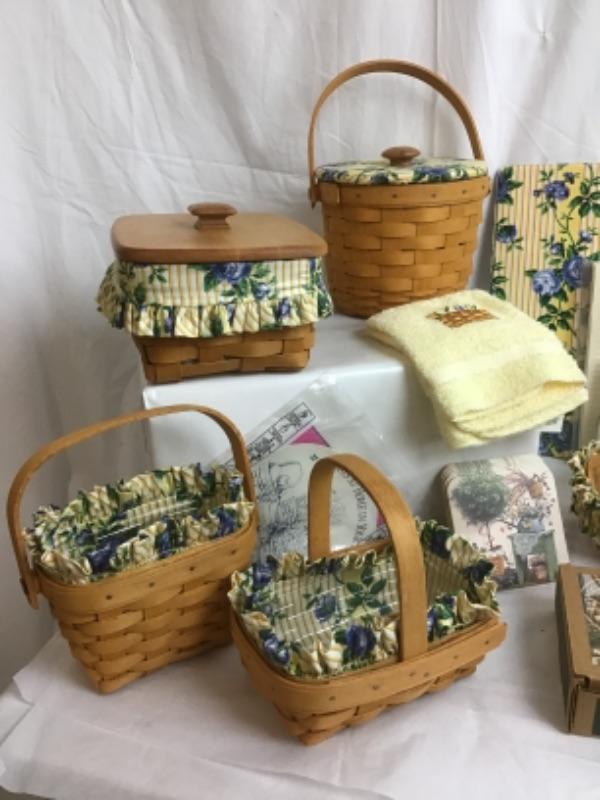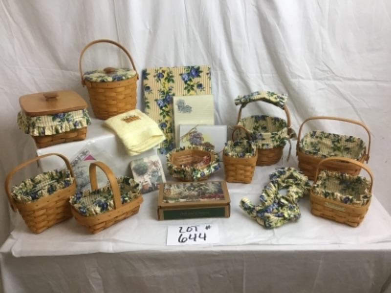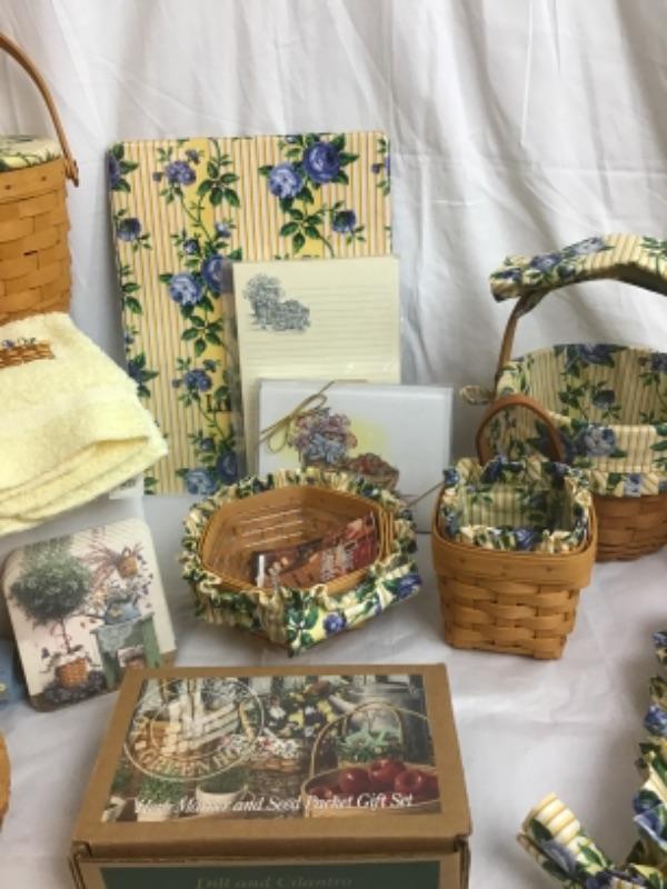 Longaberger Rose Trellis Gift Lot has many different baskets of shapes & sizes - 9 baskets in total with plastic and fabric liners, also included is stationary, jar Gripper, Coaster, all Longaberger