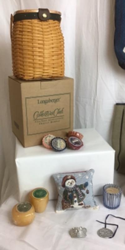This is a Longaberger Collectors Club Gift Lot, it includes 3 Collectors baskets, Longaberger Tote, Candles, Yankee potpourri Tarts, Small pillow,