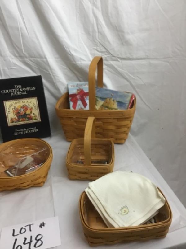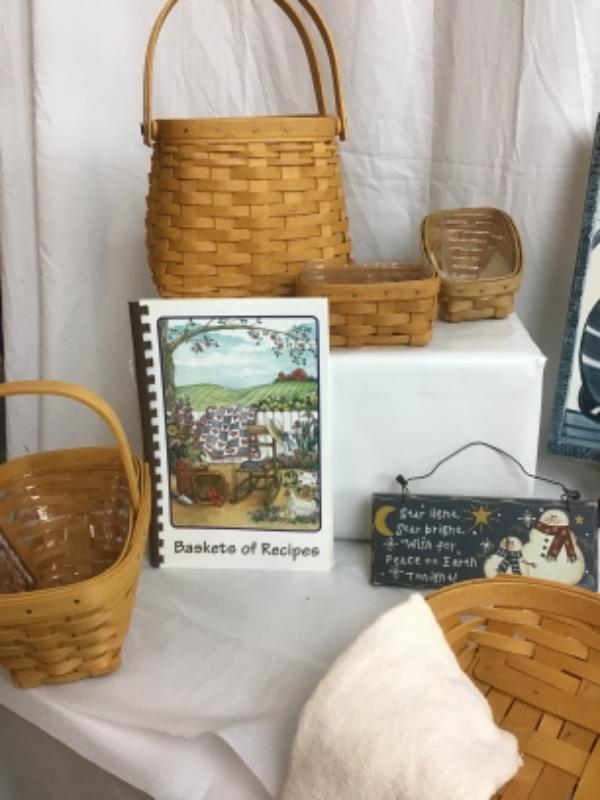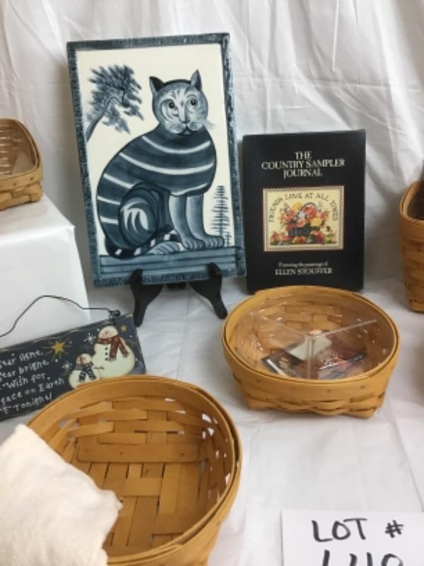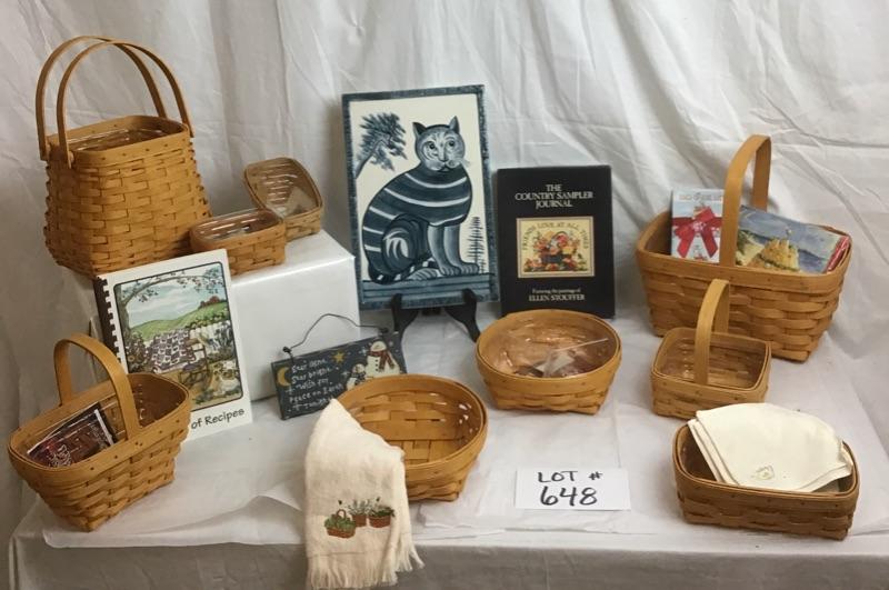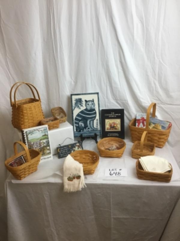 We have a variety of sizes and shapes in this lot, sure to please everyone ! 9 Baskets in all, Tea Towels, Books, Christmas Sign, Cat Tile and more
