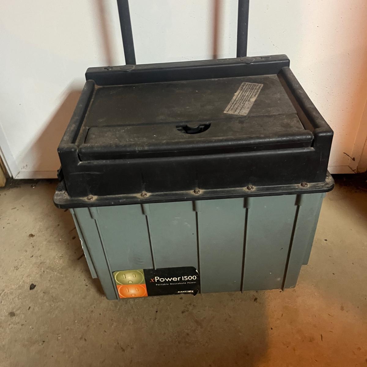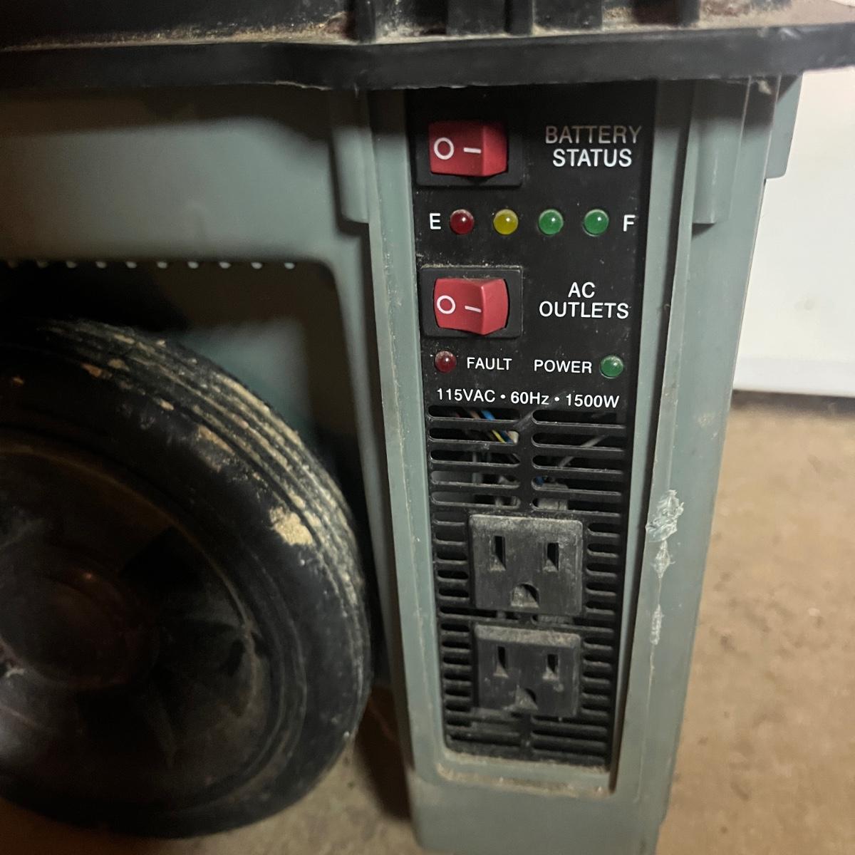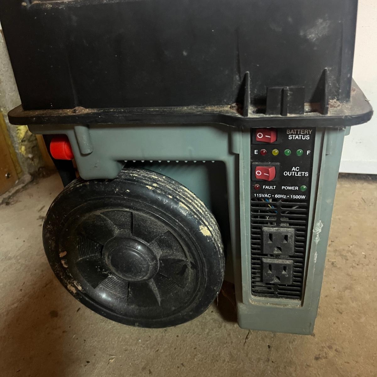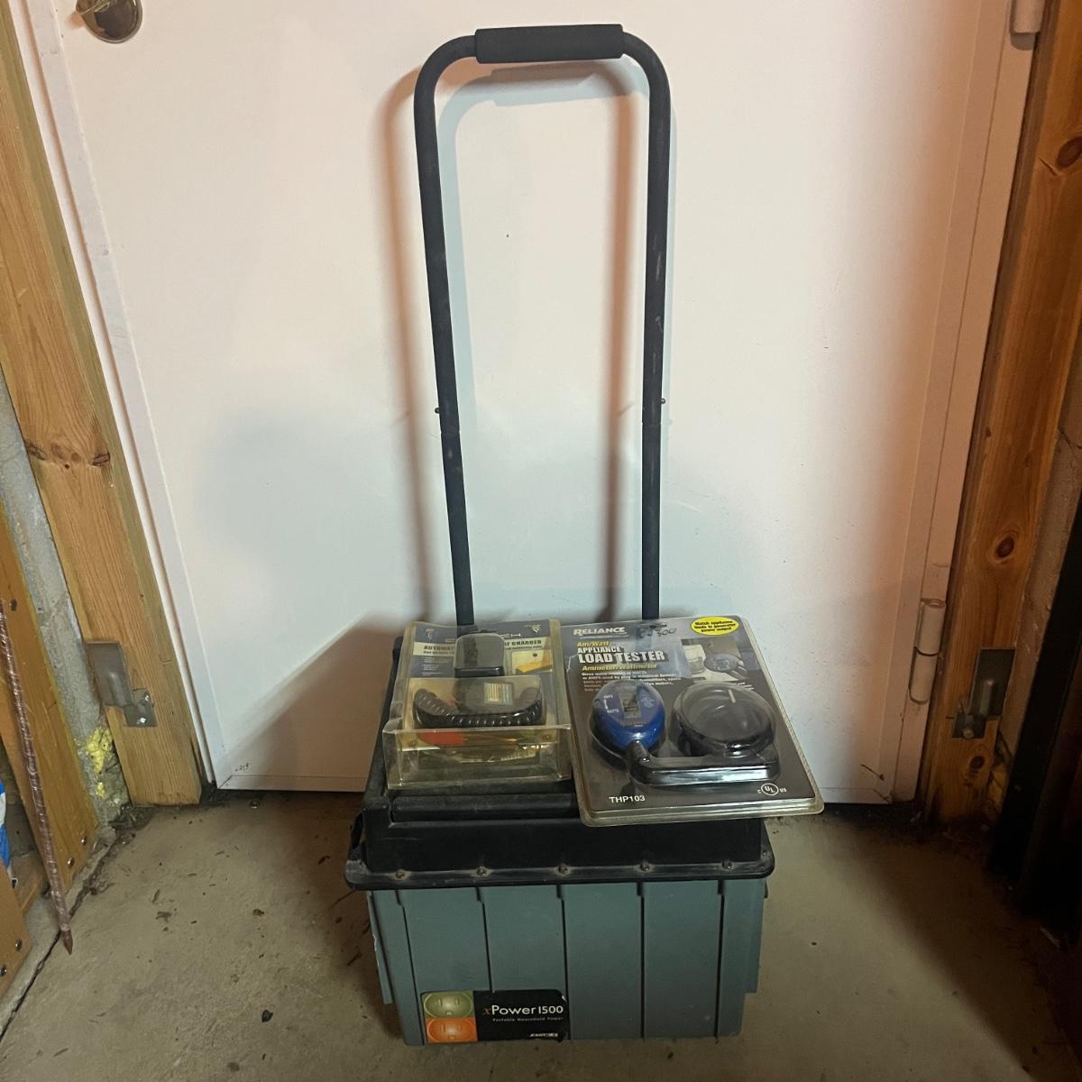 Lot includes an xPower 1500 portable household power station on wheels. Also includes a battery float charger and an appliance load tester. Power station measures 16” x 12” x 57”H. Power station was not tested as it appears battery is dead.