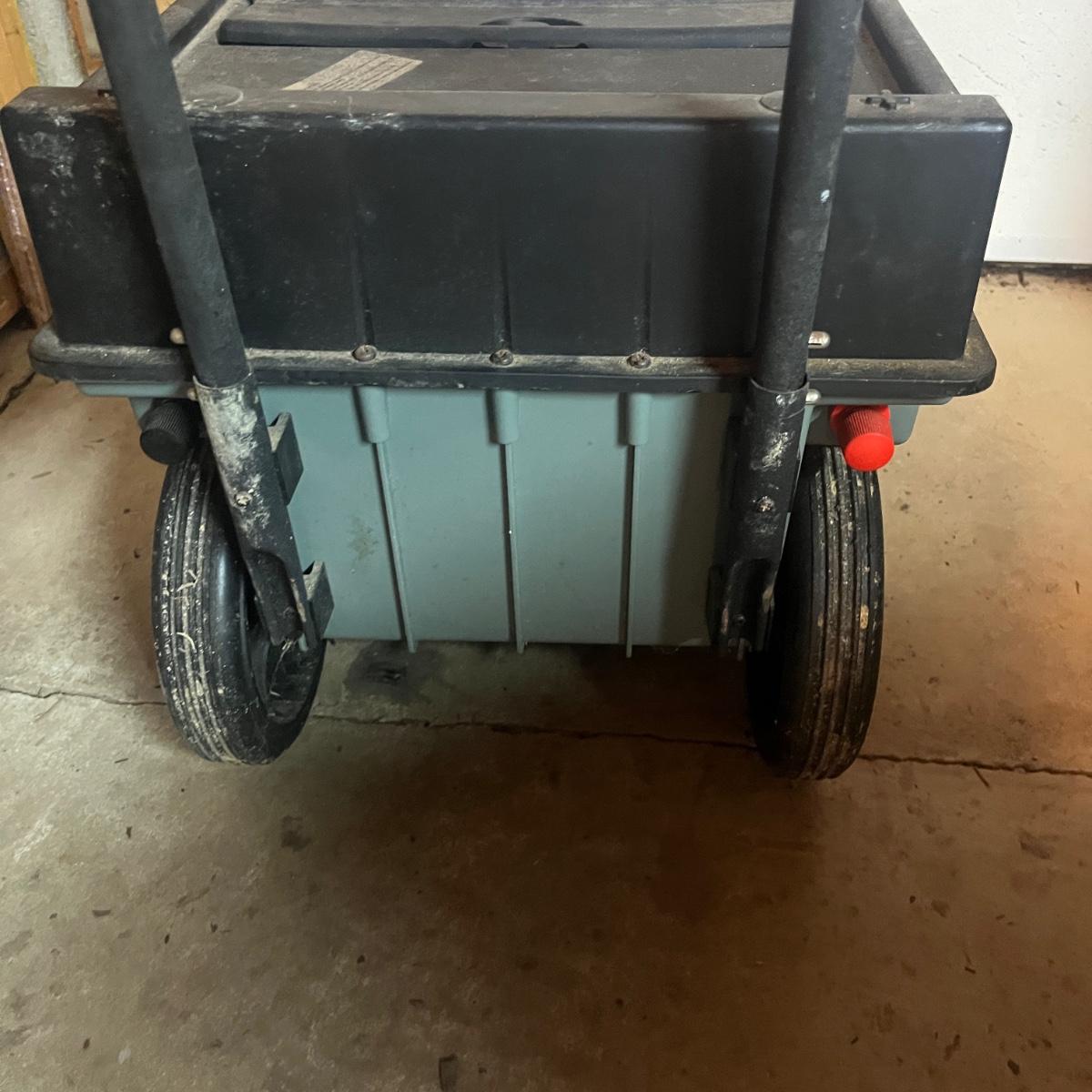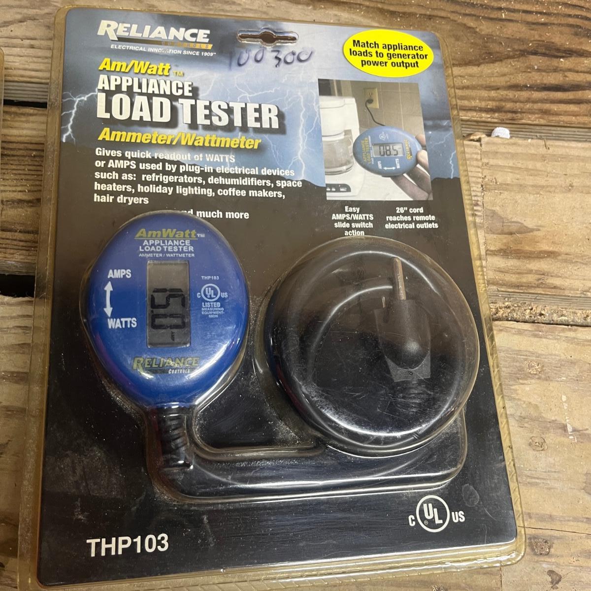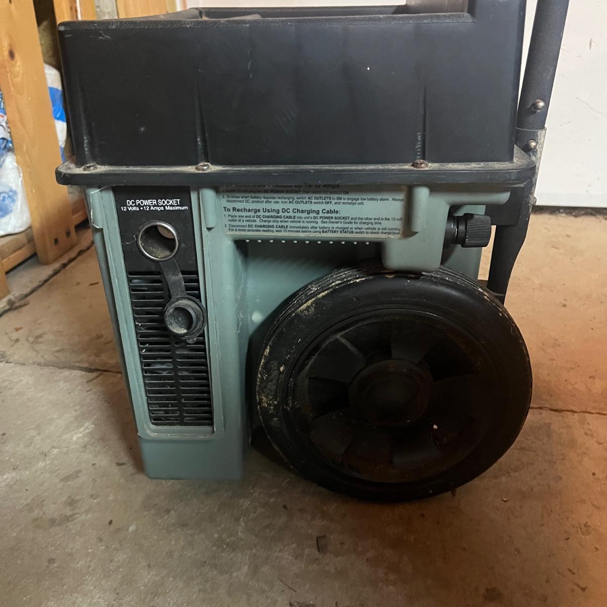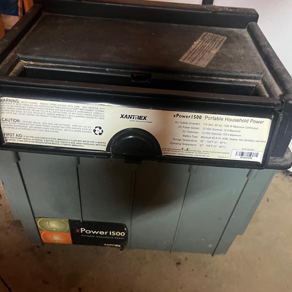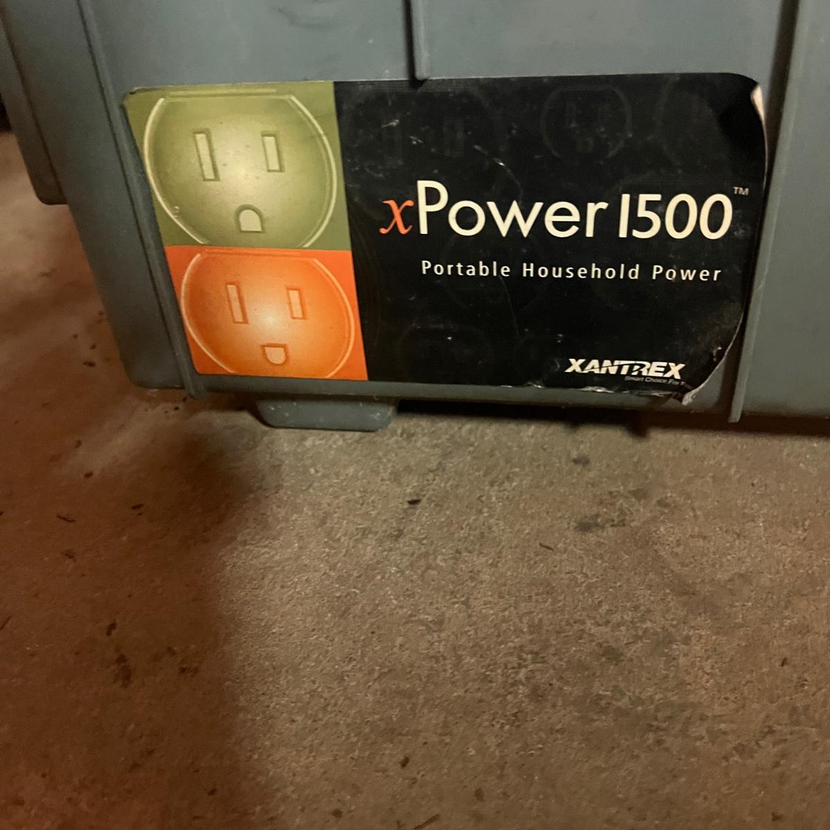Lot includes an xPower 1500 portable household power station on wheels. Also includes a battery float charger and an appliance load tester. Power station measures 16” x 12” x 57”H. Power station was not tested as it appears battery is dead.