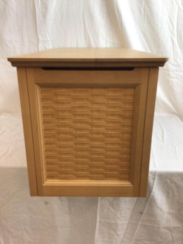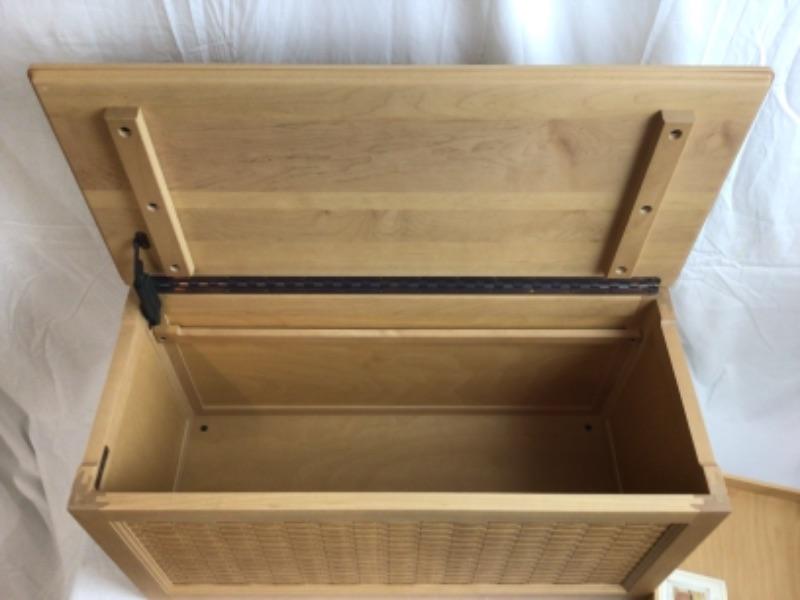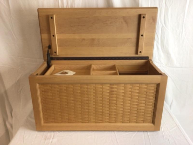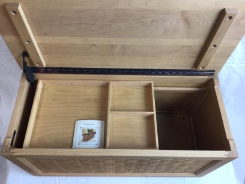 Hinged lid and sliding interior shelf, 14.5” tall x 29” long x 13” deep