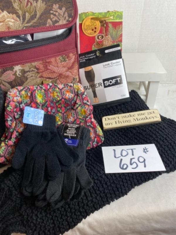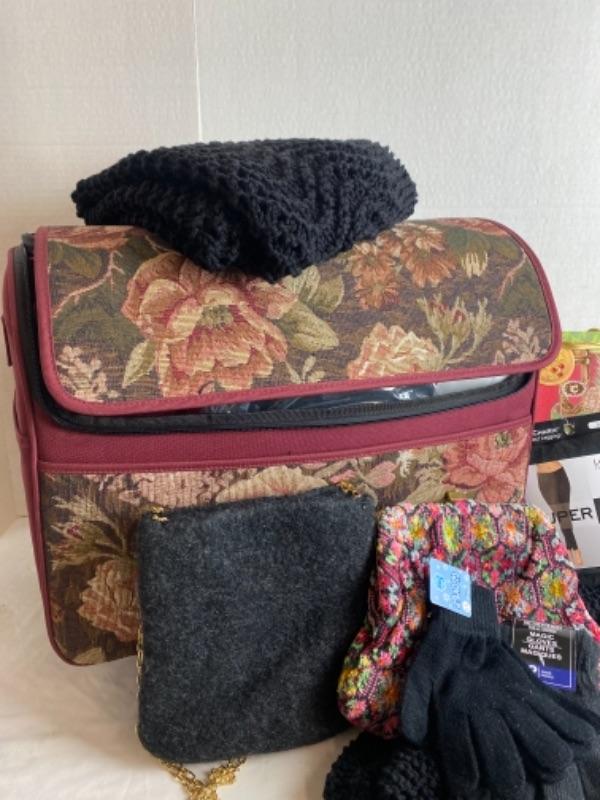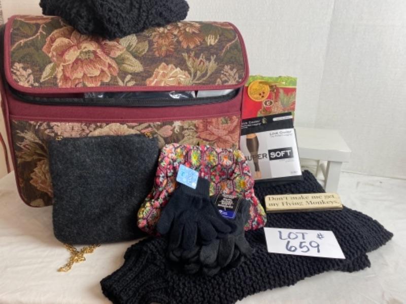 Rolling Craft bag , wool handbag, gloves, leggings, sign, scarf and more