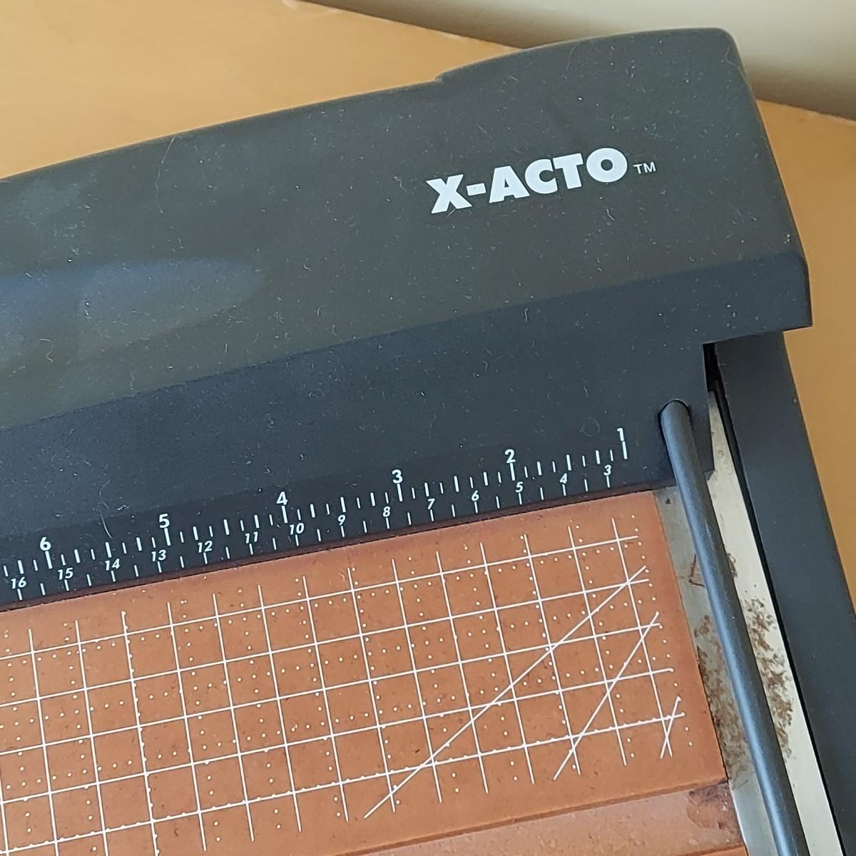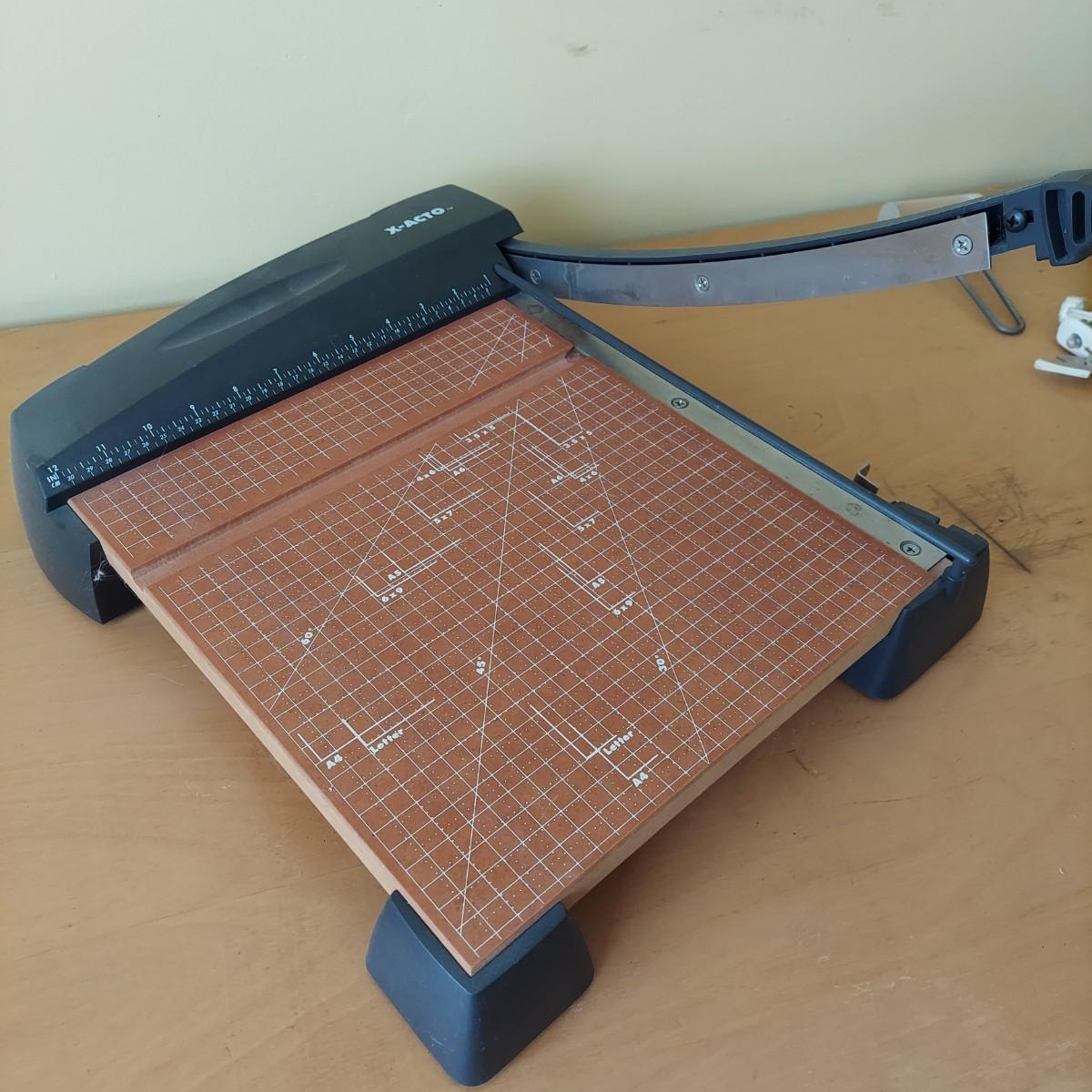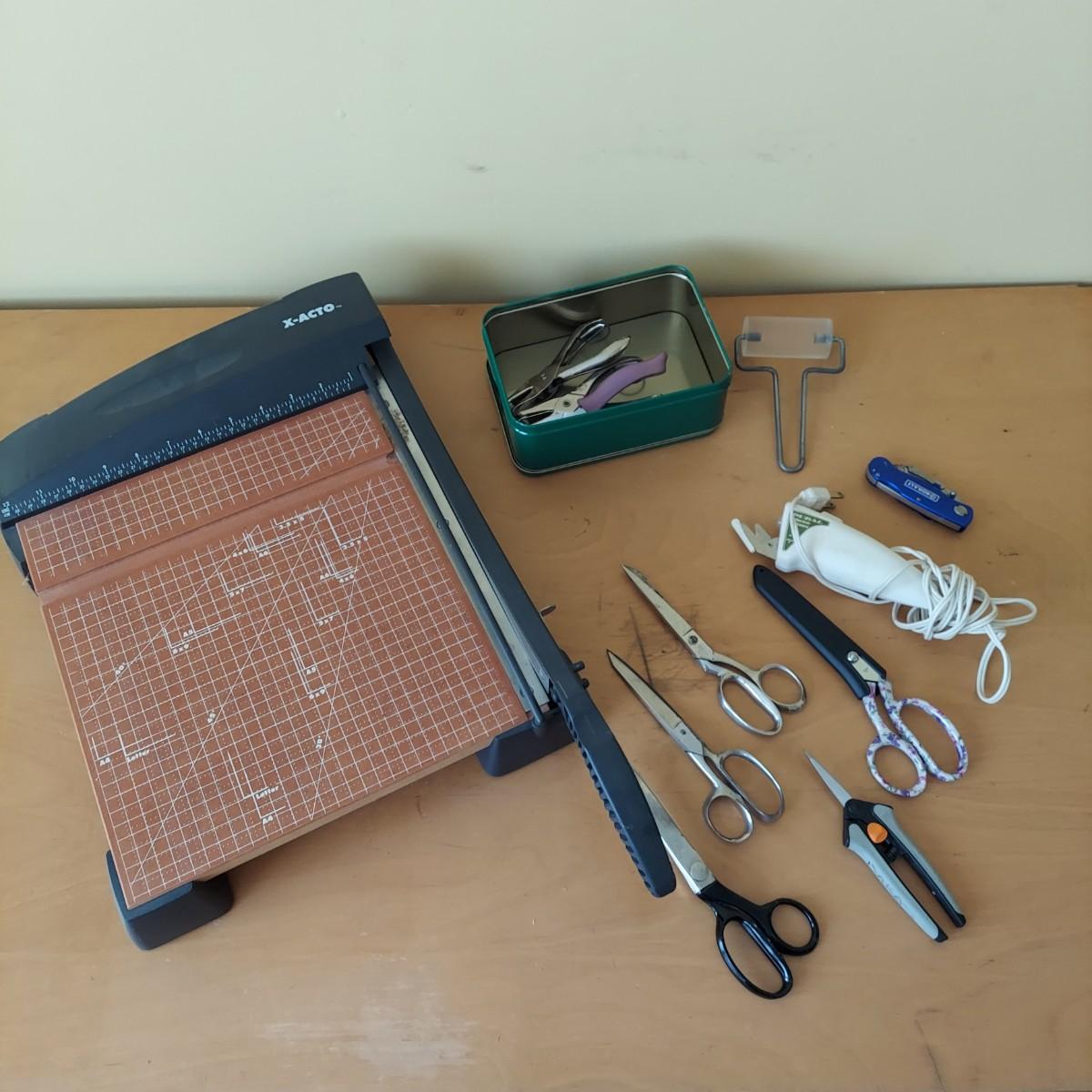 Lot includes an X-Acto brand paper Cutter with a wood plane and plastic feet, etc. It measures approximately 14” x 22” x 3.5"H. Also, several pairs of scissors including a pair of Gingher fabric shears. Please see photos for details. Shipping available