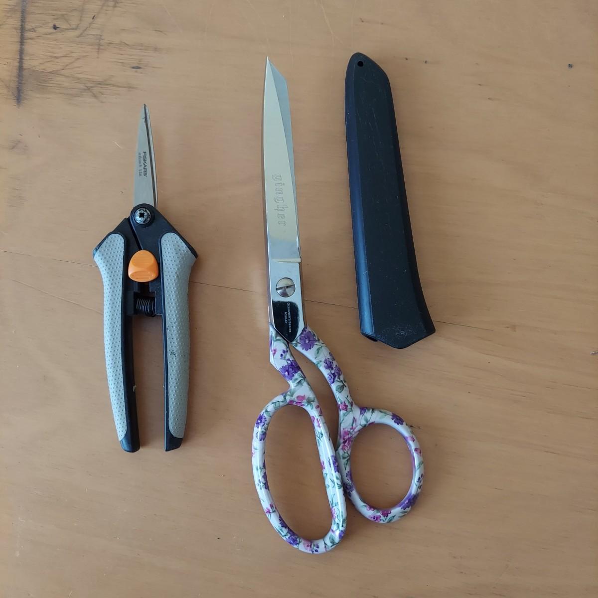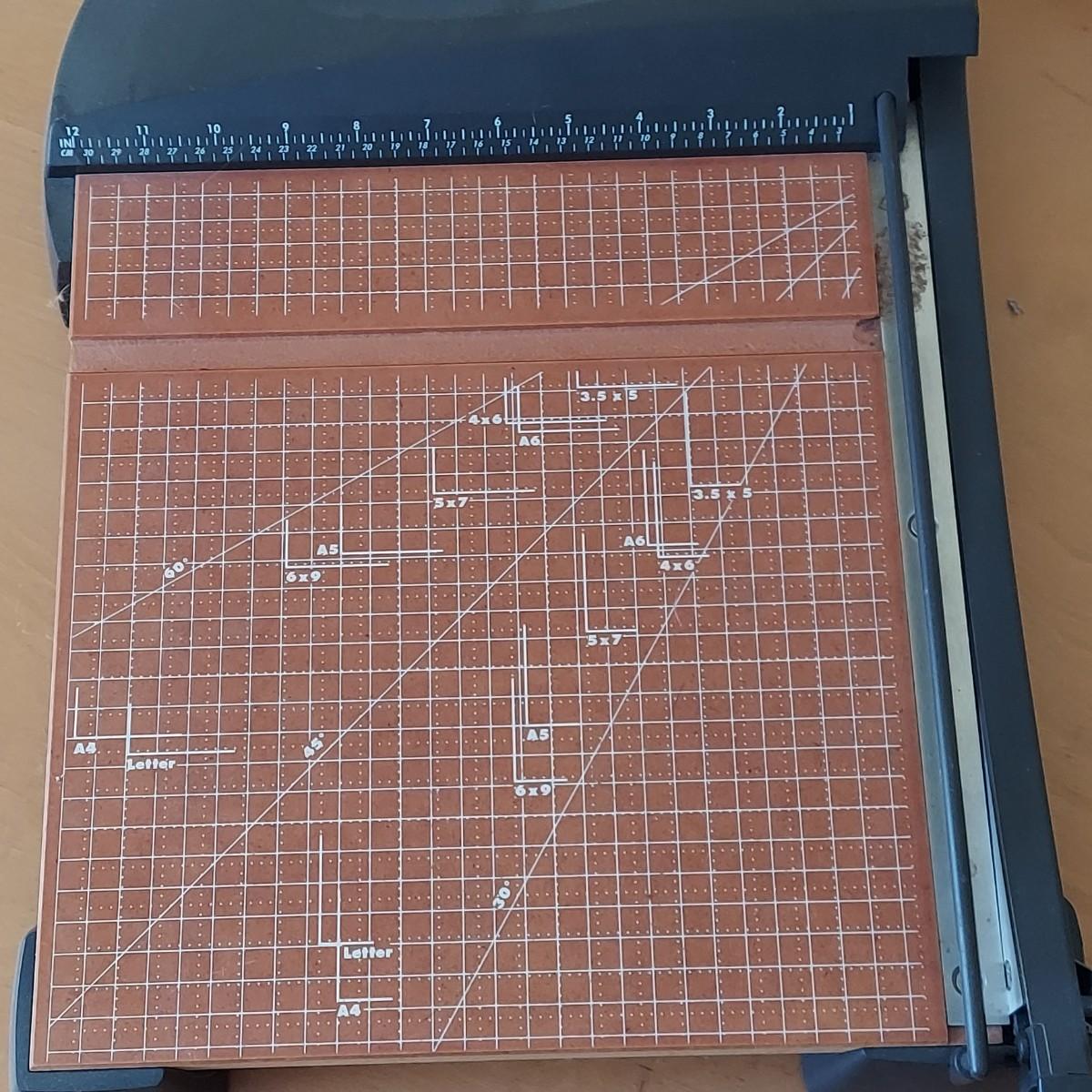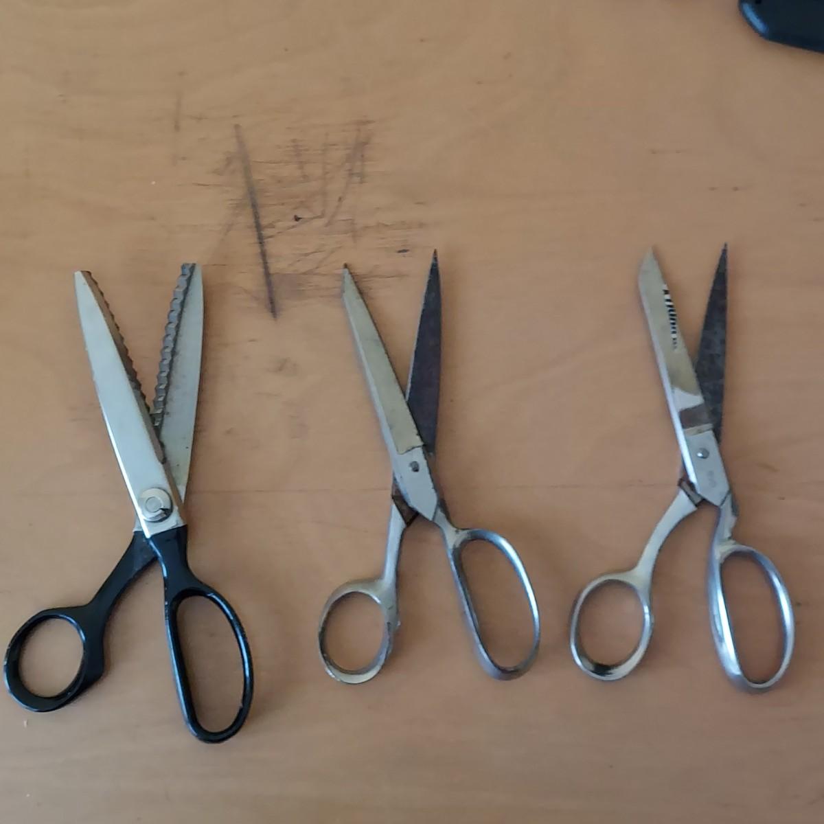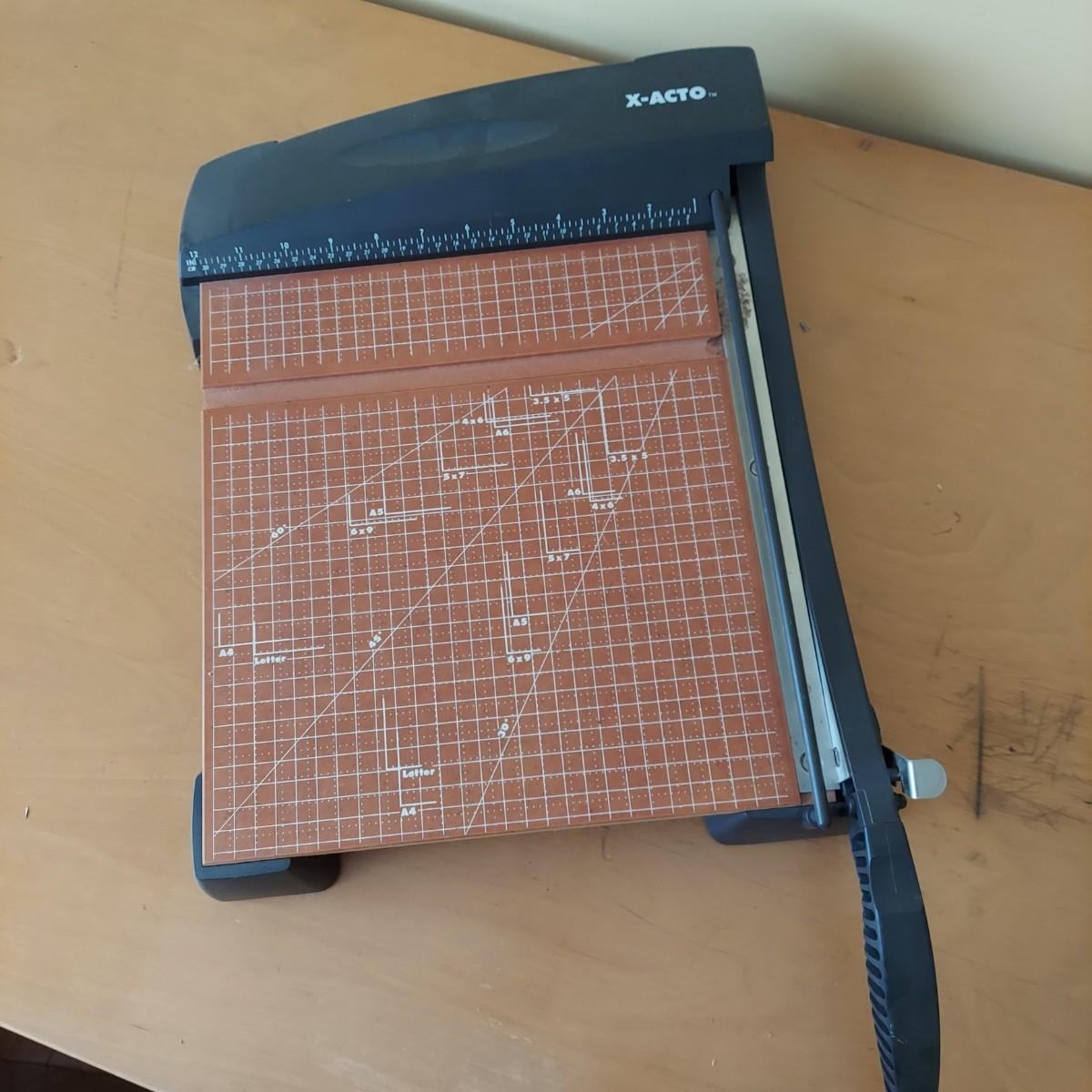 Lot includes an X-Acto brand paper Cutter with a wood plane and plastic feet, etc. It measures approximately 14” x 22” x 3.5"H. Also, several pairs of scissors including a pair of Gingher fabric shears. Please see photos for details. Shipping available