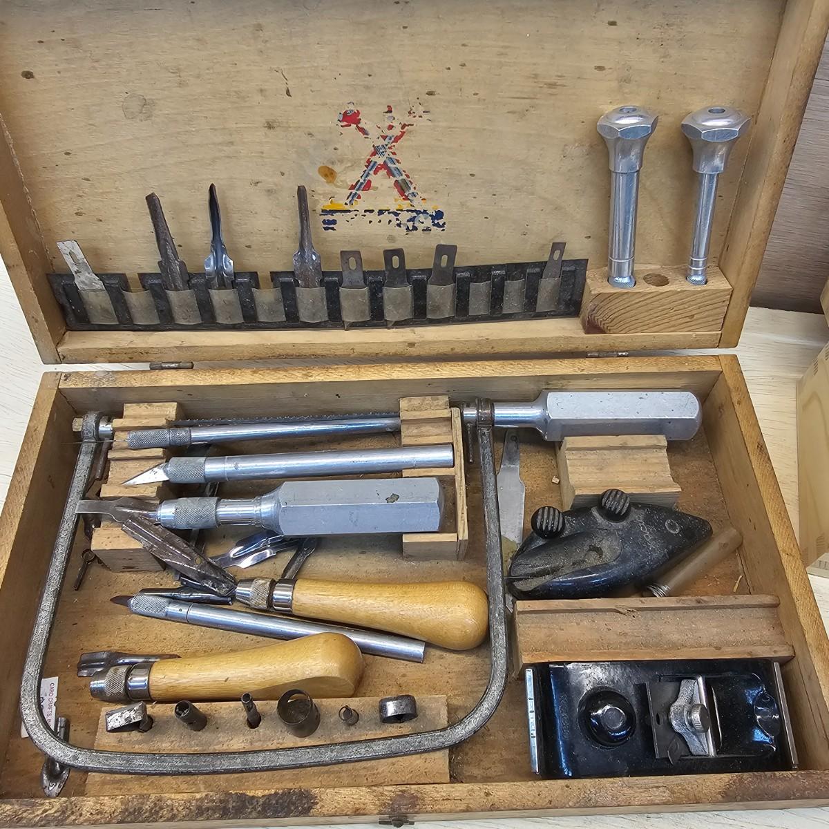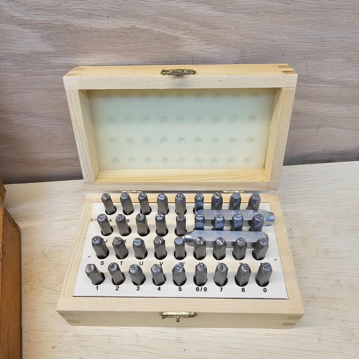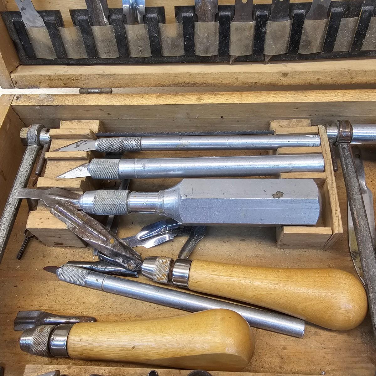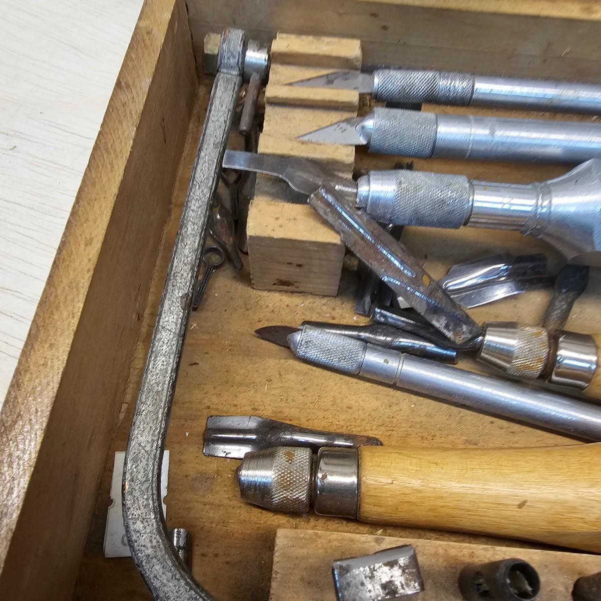 A vintage set of X-Acto tools, knives, planes, saws and more. Multiple handle sizes and blades included. Other box is a set of steel number & letter dies for stamping. These dies appear to be new. Both boxes have dovetail corners. X-Acto chest is 12" x 7" x 2"H, other is 7" x 4" x 2.75"H. See photos for details. Shipping available.