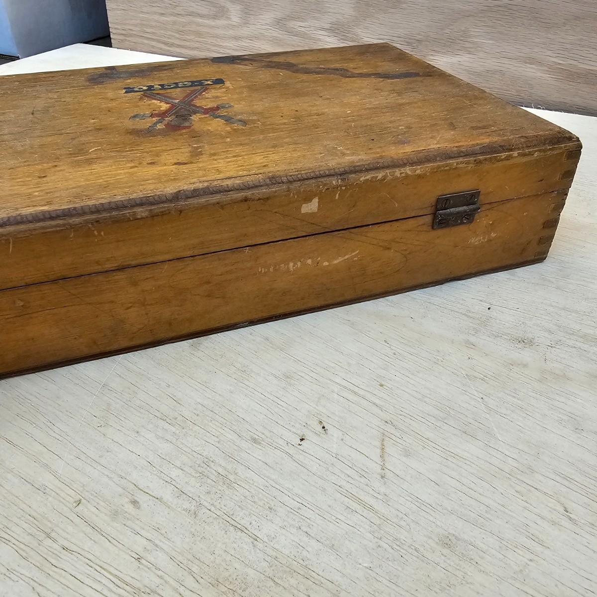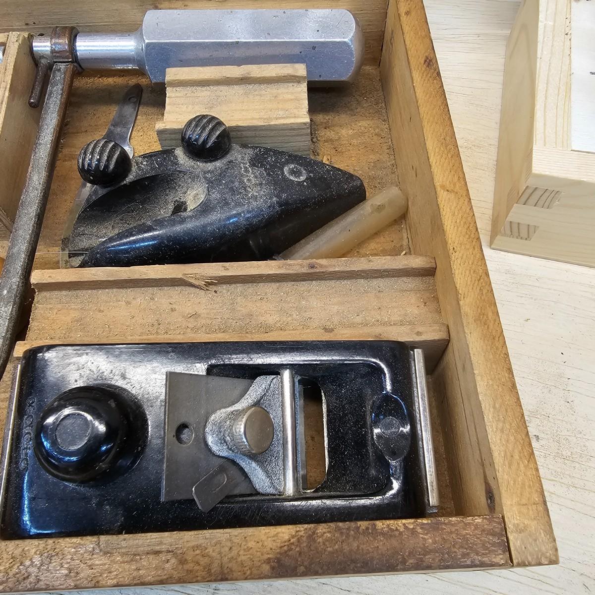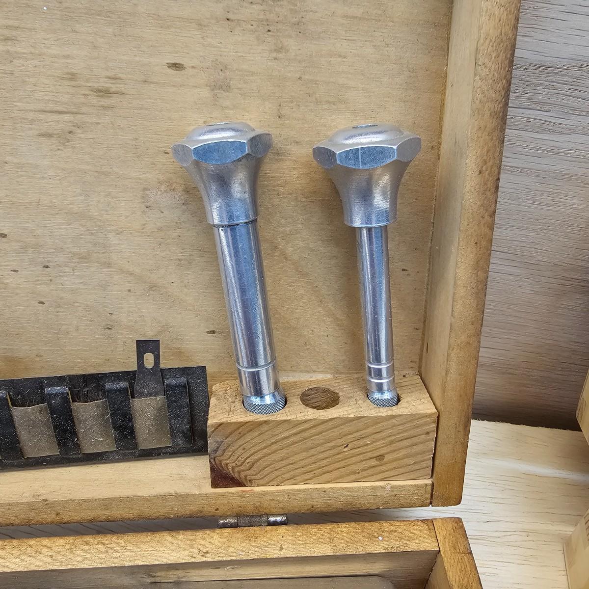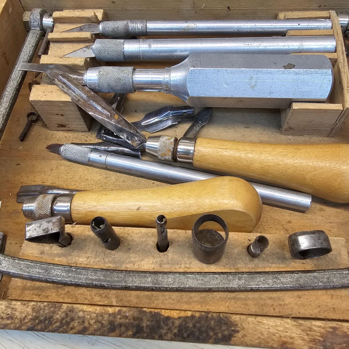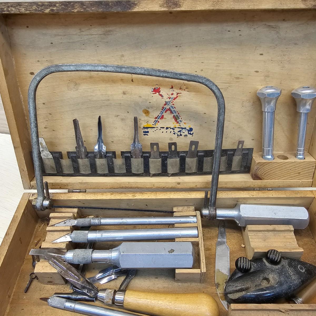 A vintage set of X-Acto tools, knives, planes, saws and more. Multiple handle sizes and blades included. Other box is a set of steel number & letter dies for stamping. These dies appear to be new. Both boxes have dovetail corners. X-Acto chest is 12" x 7" x 2"H, other is 7" x 4" x 2.75"H. See photos for details. Shipping available.