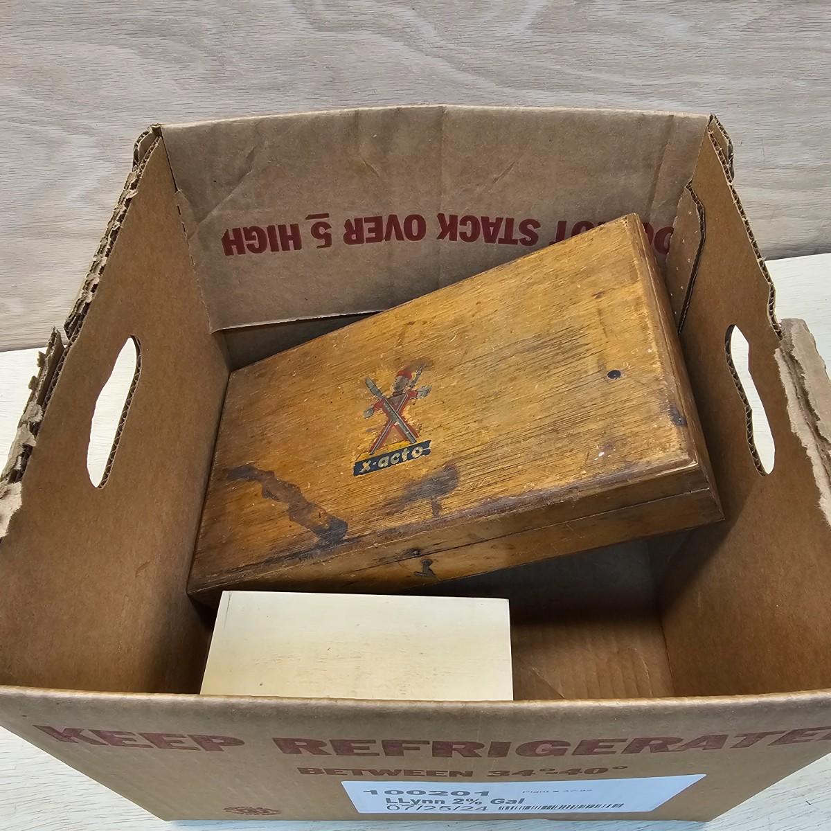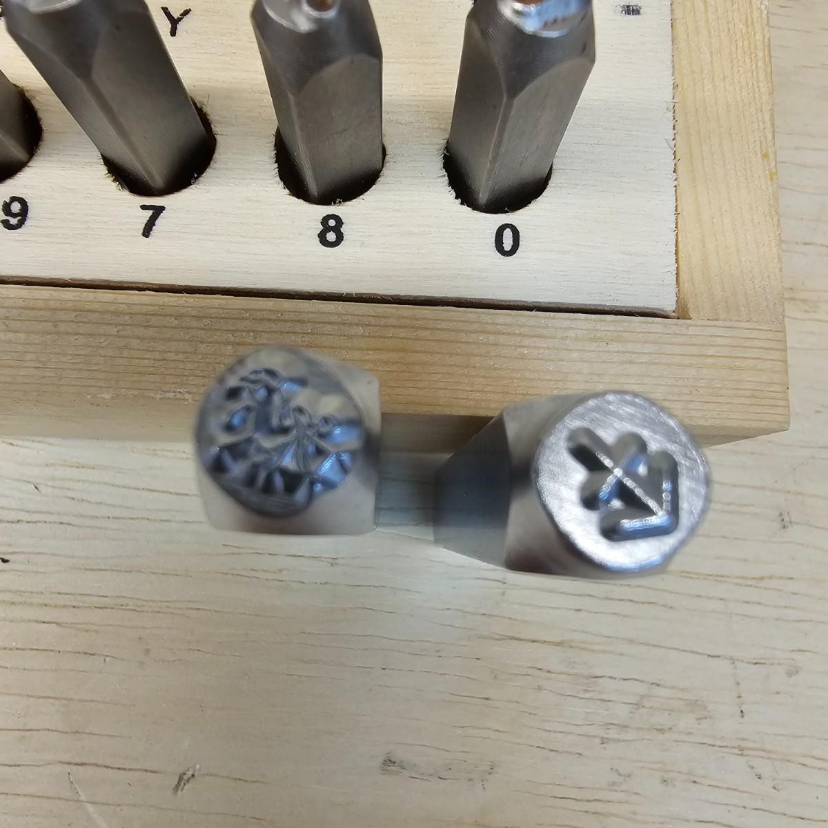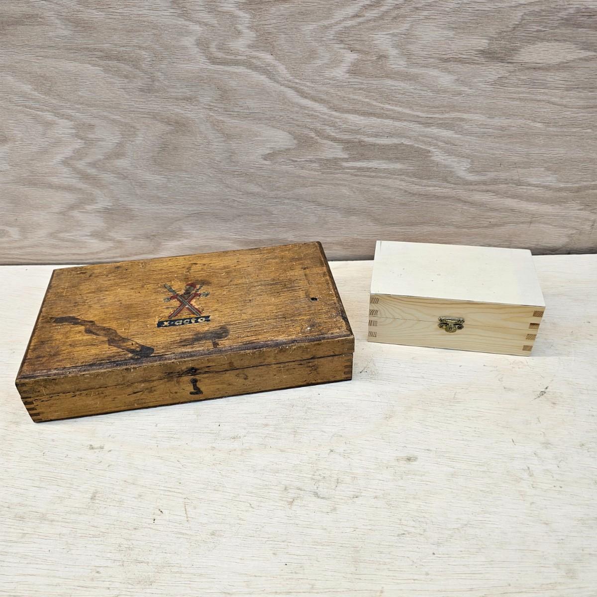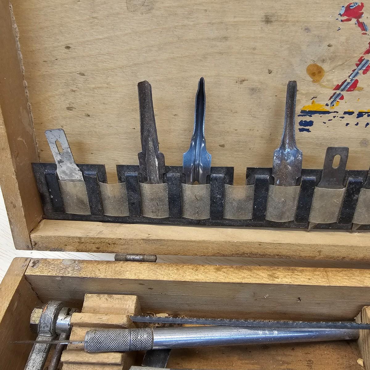 A vintage set of X-Acto tools, knives, planes, saws and more. Multiple handle sizes and blades included. Other box is a set of steel number & letter dies for stamping. These dies appear to be new. Both boxes have dovetail corners. X-Acto chest is 12" x 7" x 2"H, other is 7" x 4" x 2.75"H. See photos for details. Shipping available.