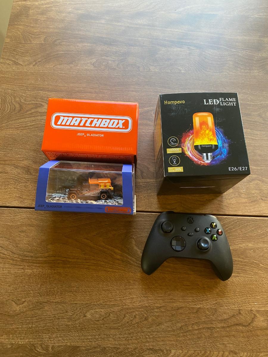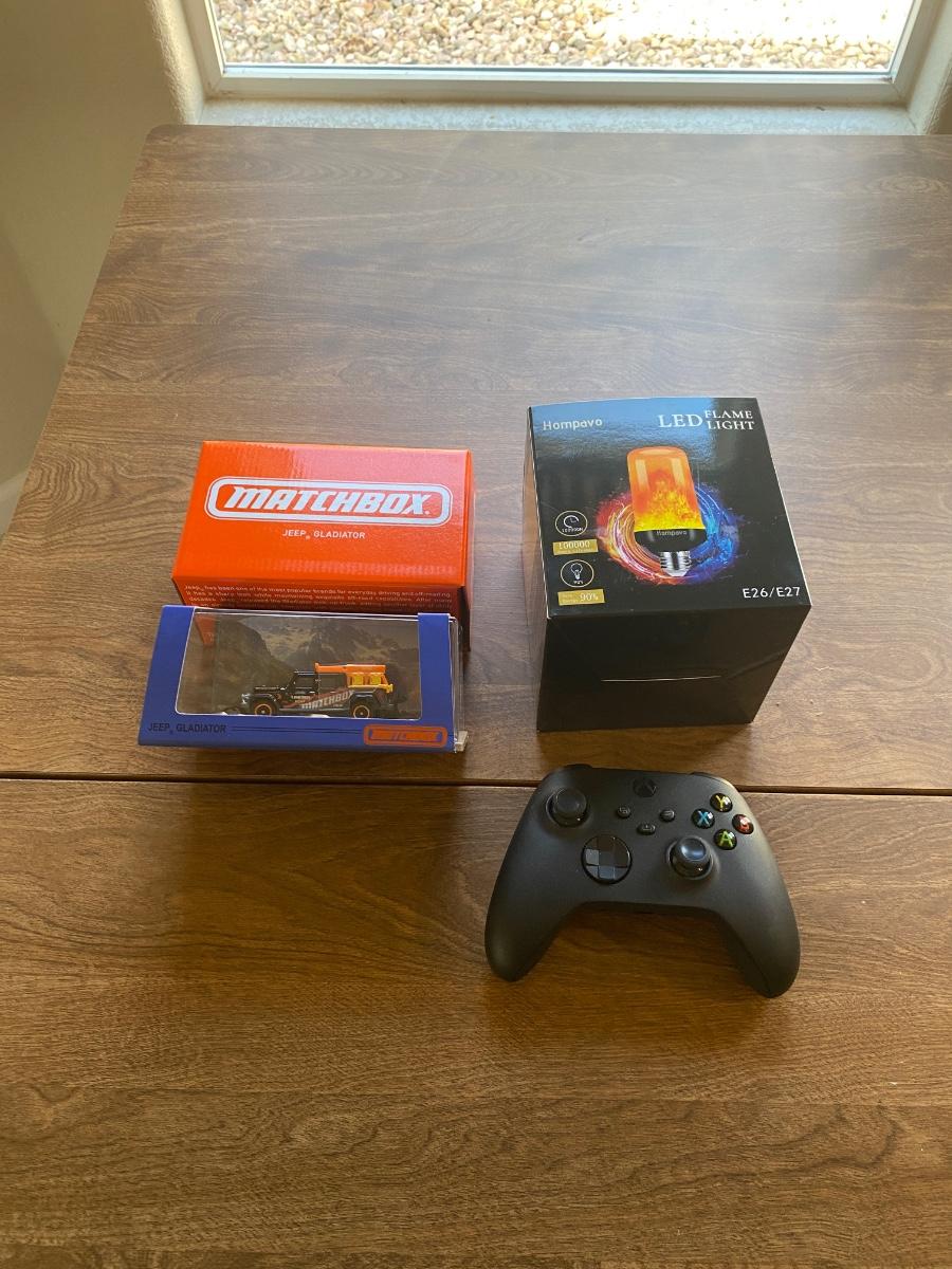 X-BOX GAMING CONTROLLER, COLLECTABLE MATCHBOX JEEP AND FIRE LIGHT BULB
