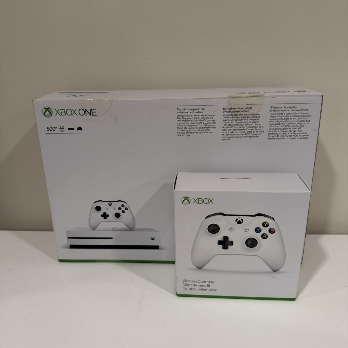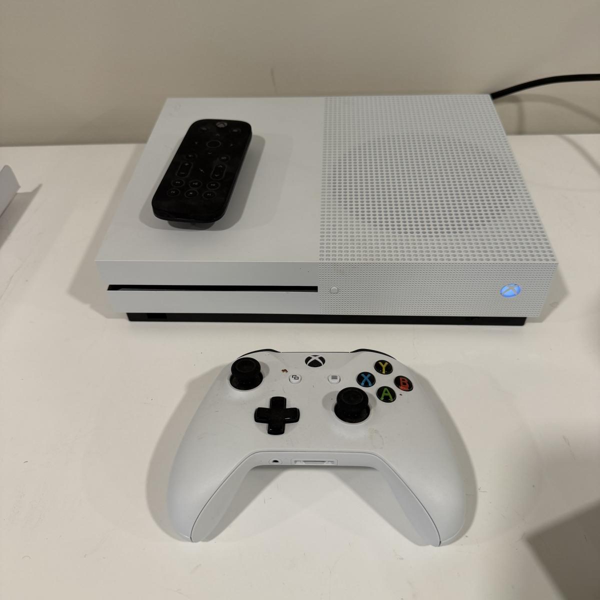 Lot includes a XBOX One with remote and two wireless controllers. Xbox One powered on when plugged in. Controllers and remote have no batteries.