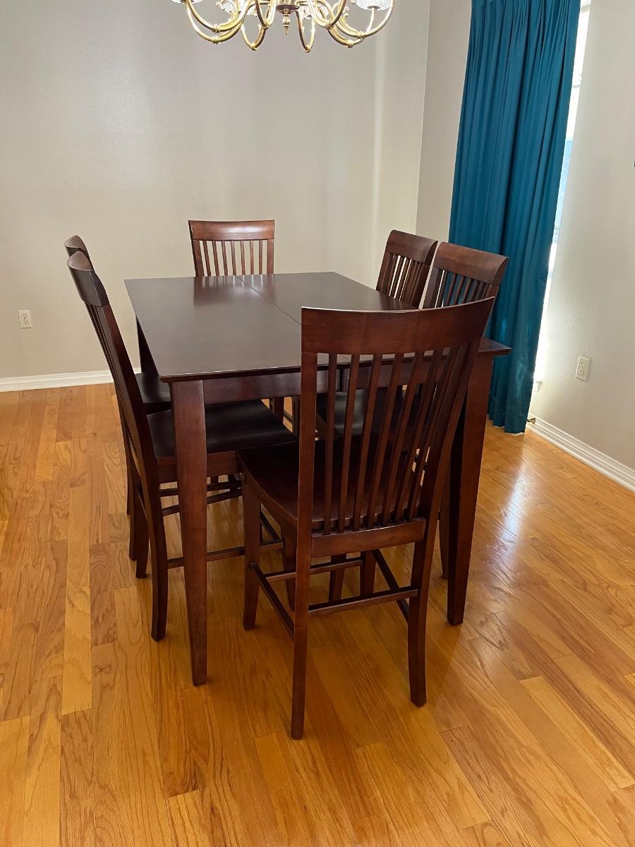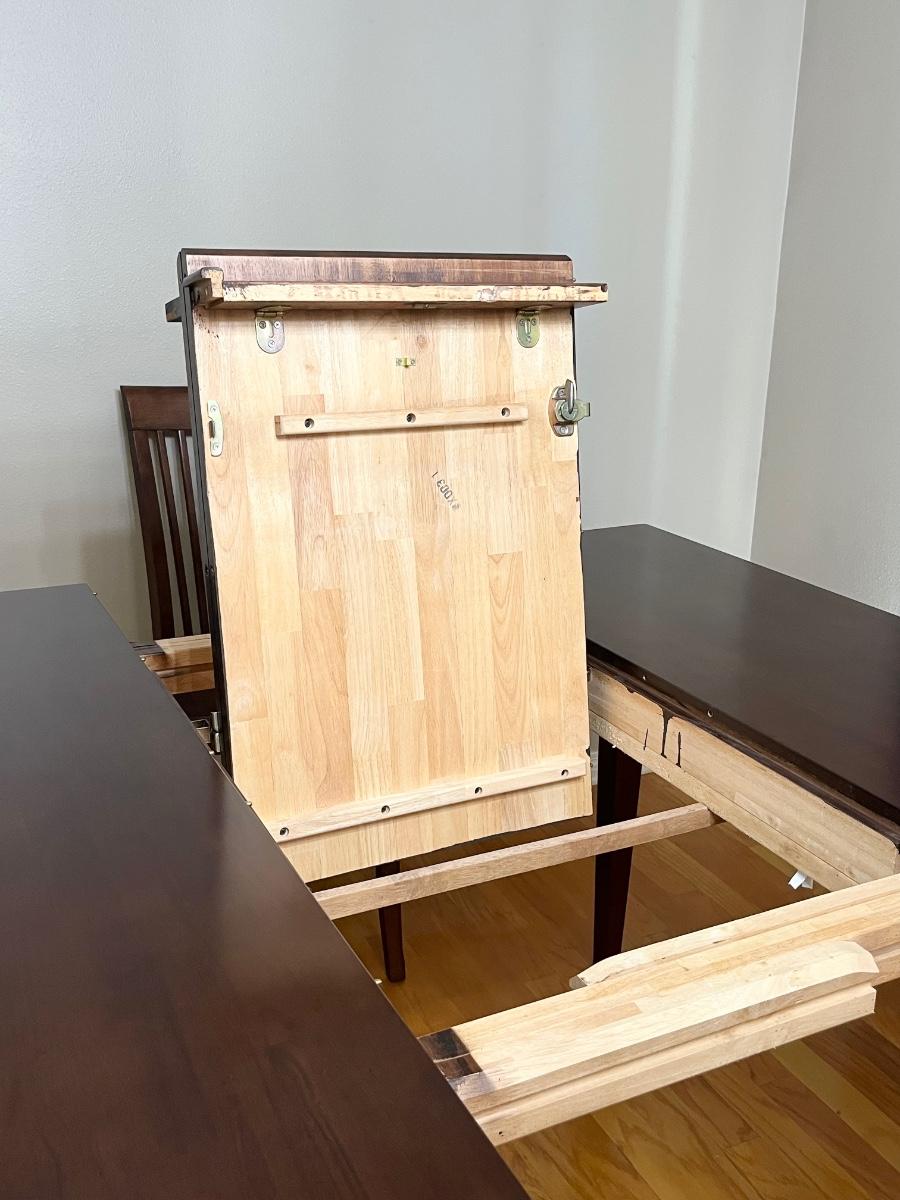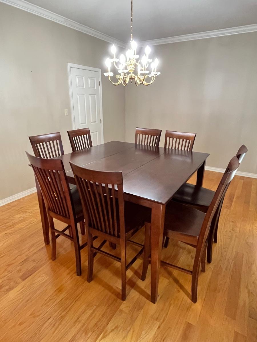Table with leaf = 36.5” H x 53” 53” W & can accommodate 8 chairs ~ Table with leaf folded = W x 36” D & can accommodate 6 chairs ~ Chairs measure 44” H x 17.5” W x 21” D