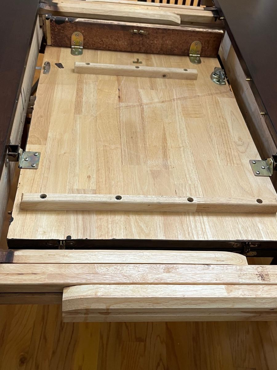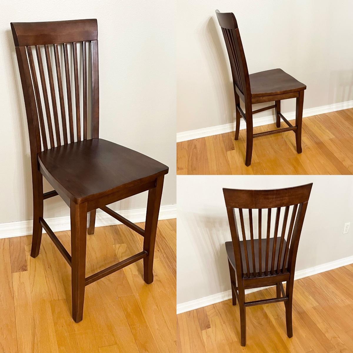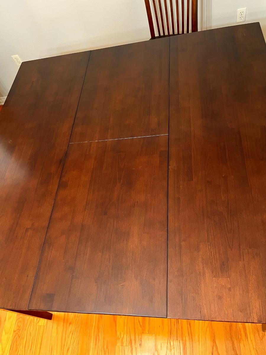 Table with leaf = 36.5” H x 53” 53” W & can accommodate 8 chairs ~ Table with leaf folded = W x 36” D & can accommodate 6 chairs ~ Chairs measure 44” H x 17.5” W x 21” D