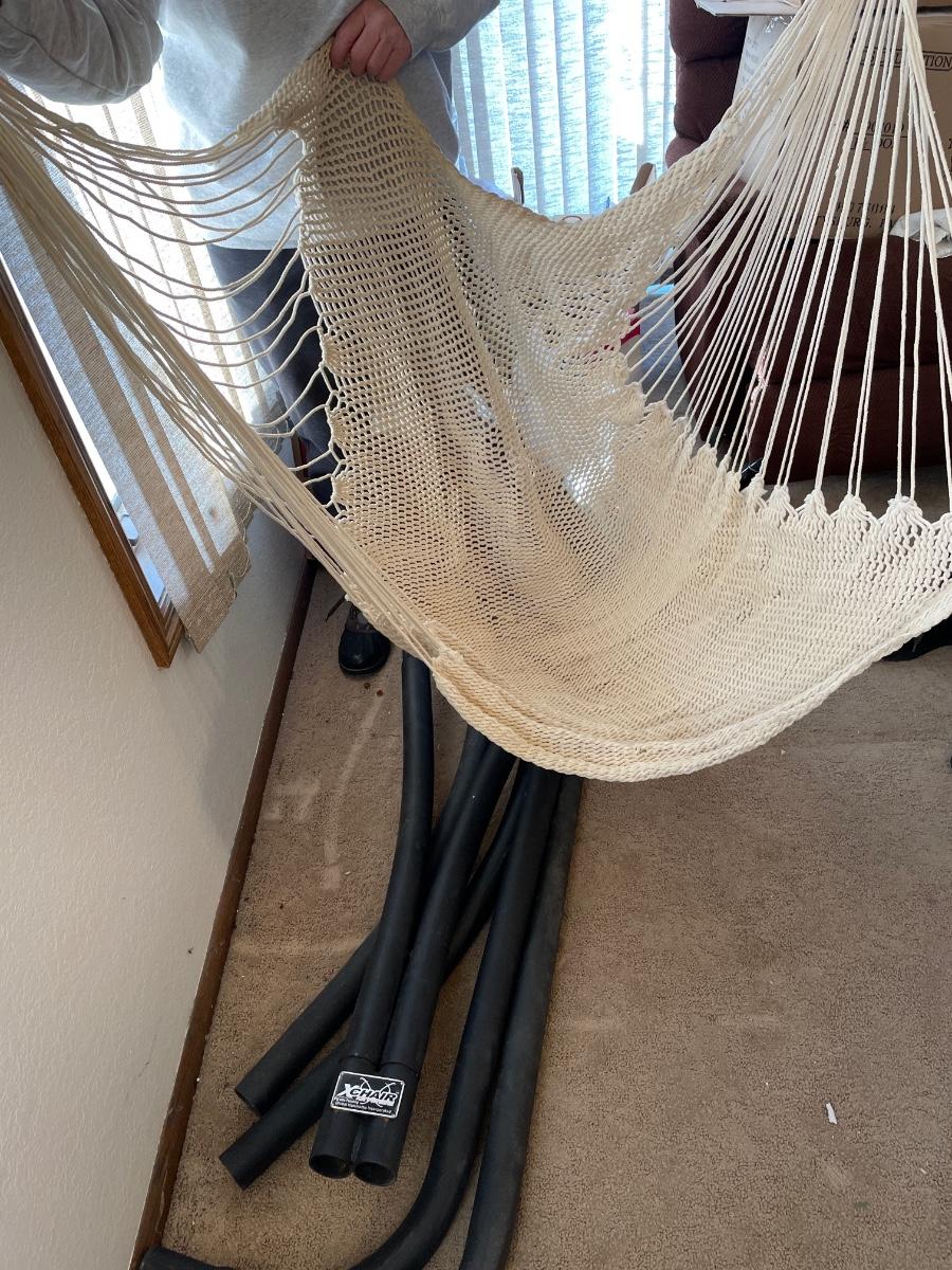 See pics. Did not assemble, missing hooks for hammock. Pic of one assembled