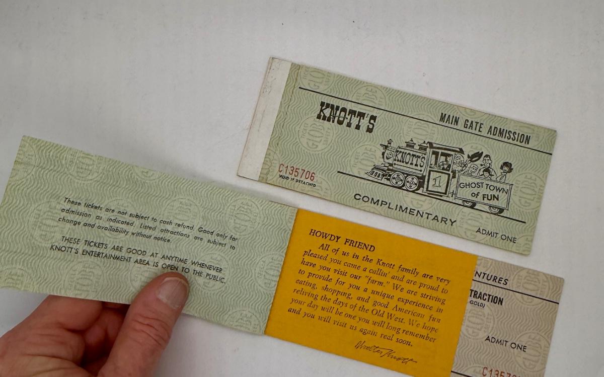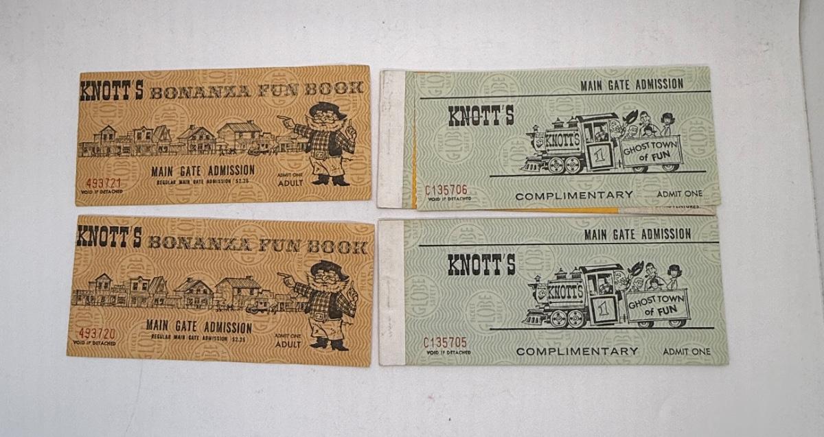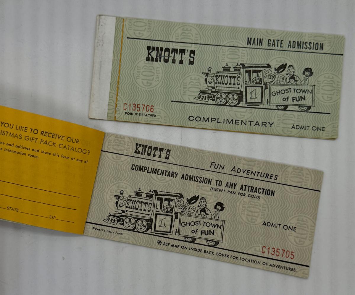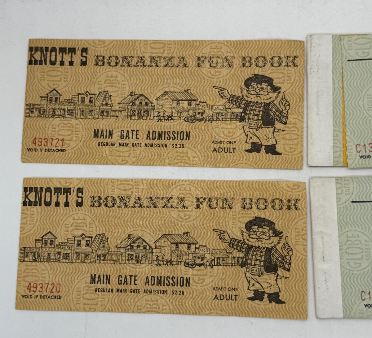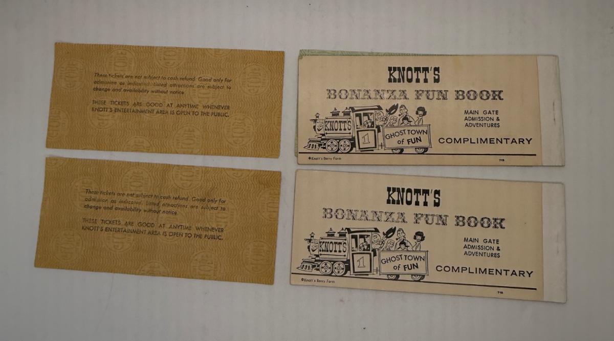Complimentary Ghost Town of Fun Knott's Berry Farm & Ghost Town in Buena Park California from 1970's time period. The Ticket Books originally included the Main Gate Admission Ticket and Five Adventure Tickets. These books still contain (5)) tickets, and one book has the Main Gate Intact on front, but other book has first page separated. In addition, there are two detached Bonanza Fun Book Main Gate Tickets. All tickets are in good condition. .