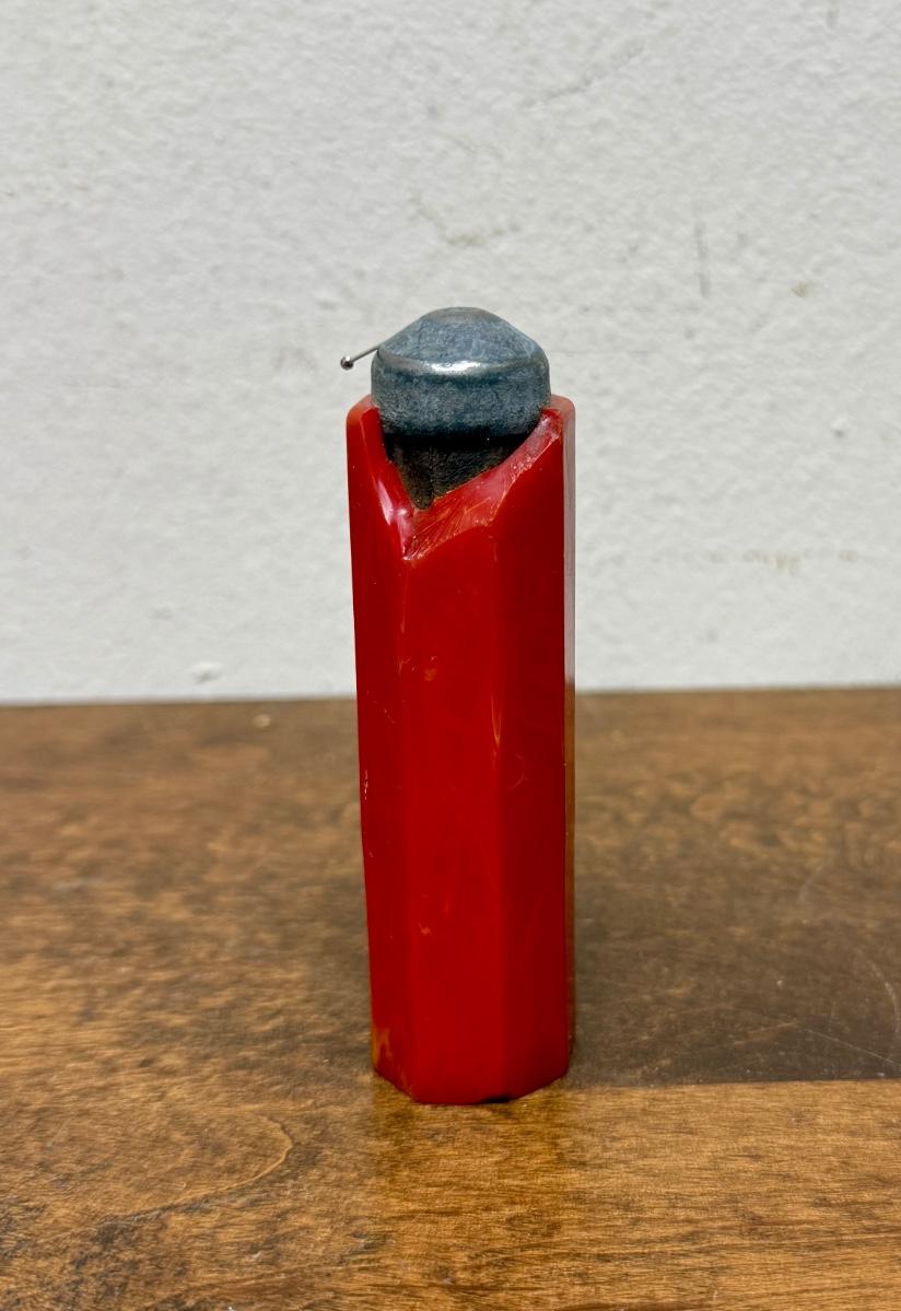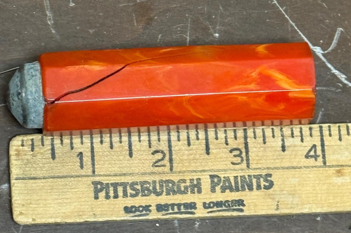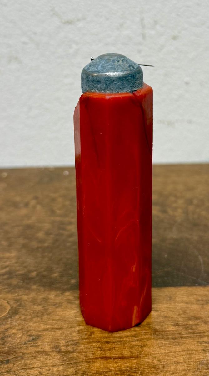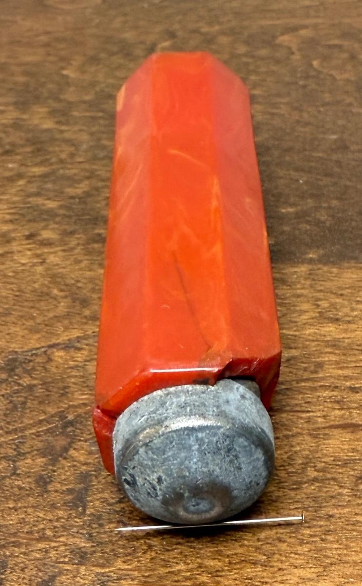 Strong magnet for holding or pulling bobby pins, covered in what appears to be marbled red bakelite. Bakelite is damaged, with a long split on one side a a section broken off near the magnetic tip. Could also be used in sewing to hold straight pins.