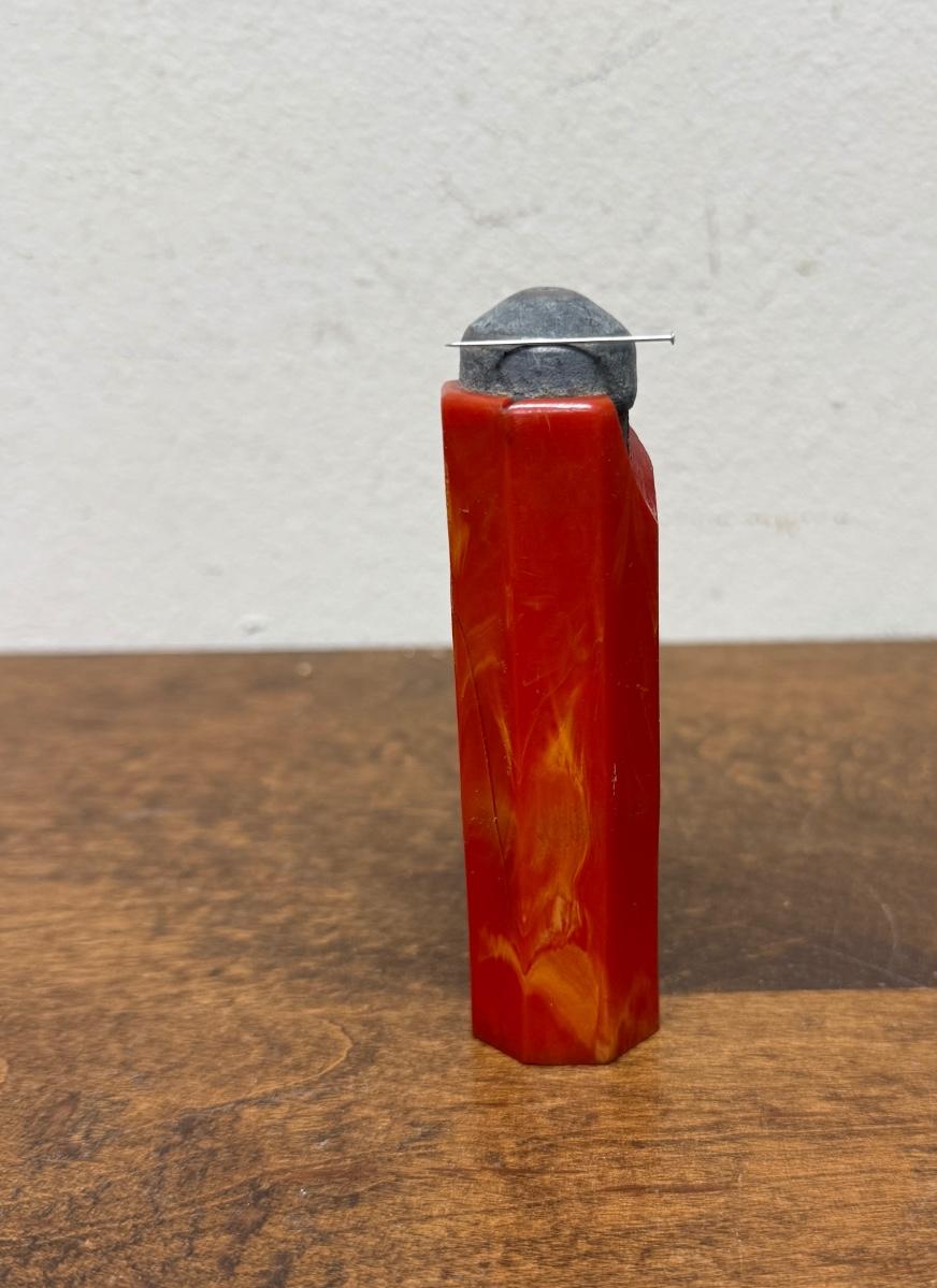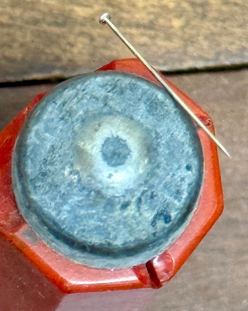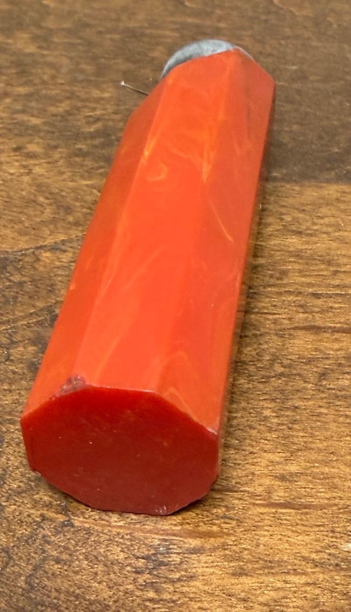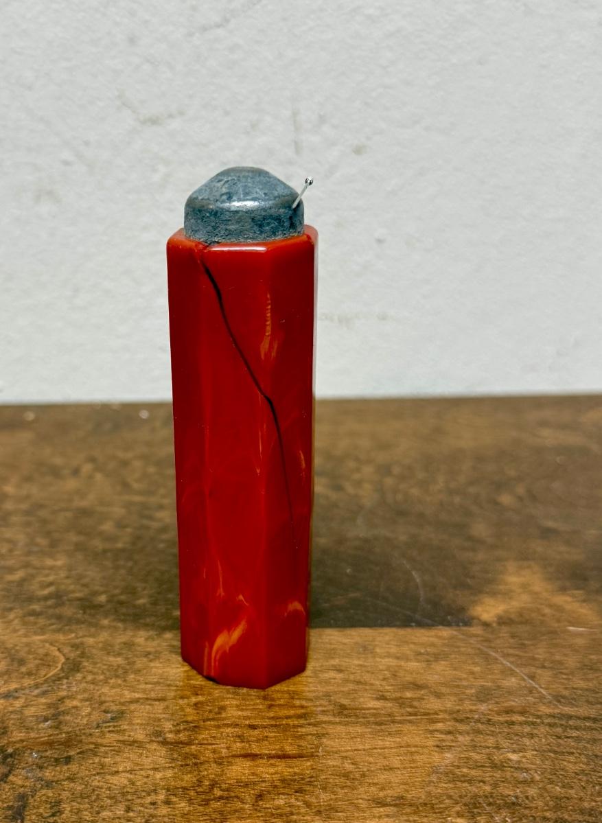 Strong magnet for holding or pulling bobby pins, covered in what appears to be marbled red bakelite. Bakelite is damaged, with a long split on one side a a section broken off near the magnetic tip. Could also be used in sewing to hold straight pins.