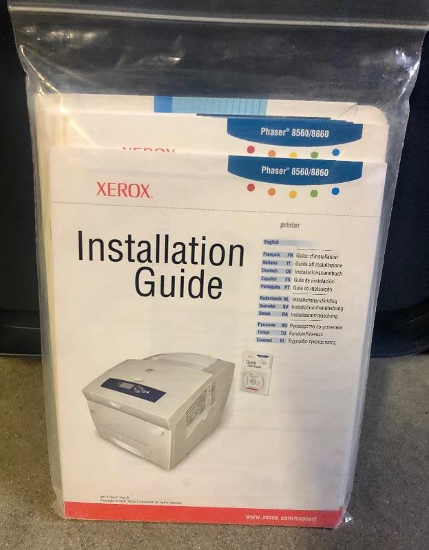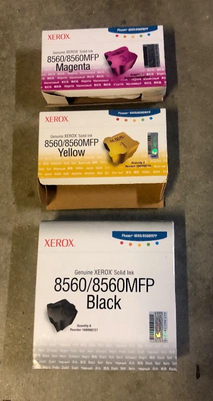 Xerox Phaser 8560 printer. Comes with installation guide and 3 different color ink refills (1 magenta, 1 yellow and 3 black individual solid inks, refill boxes are open and some were already used).