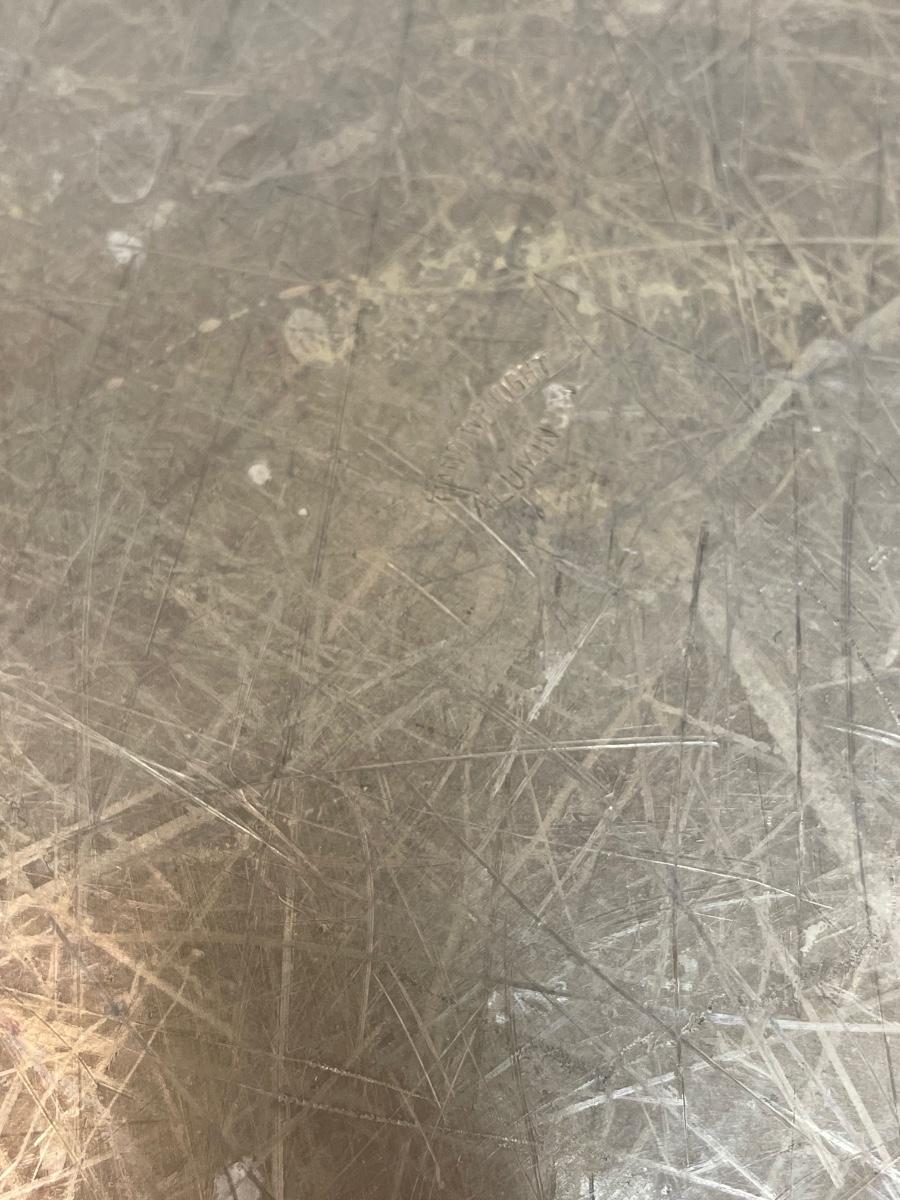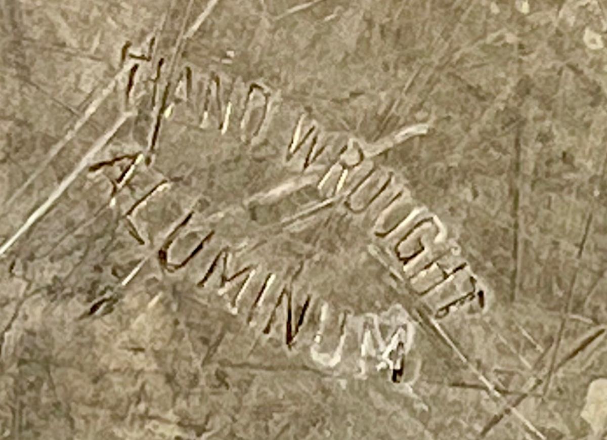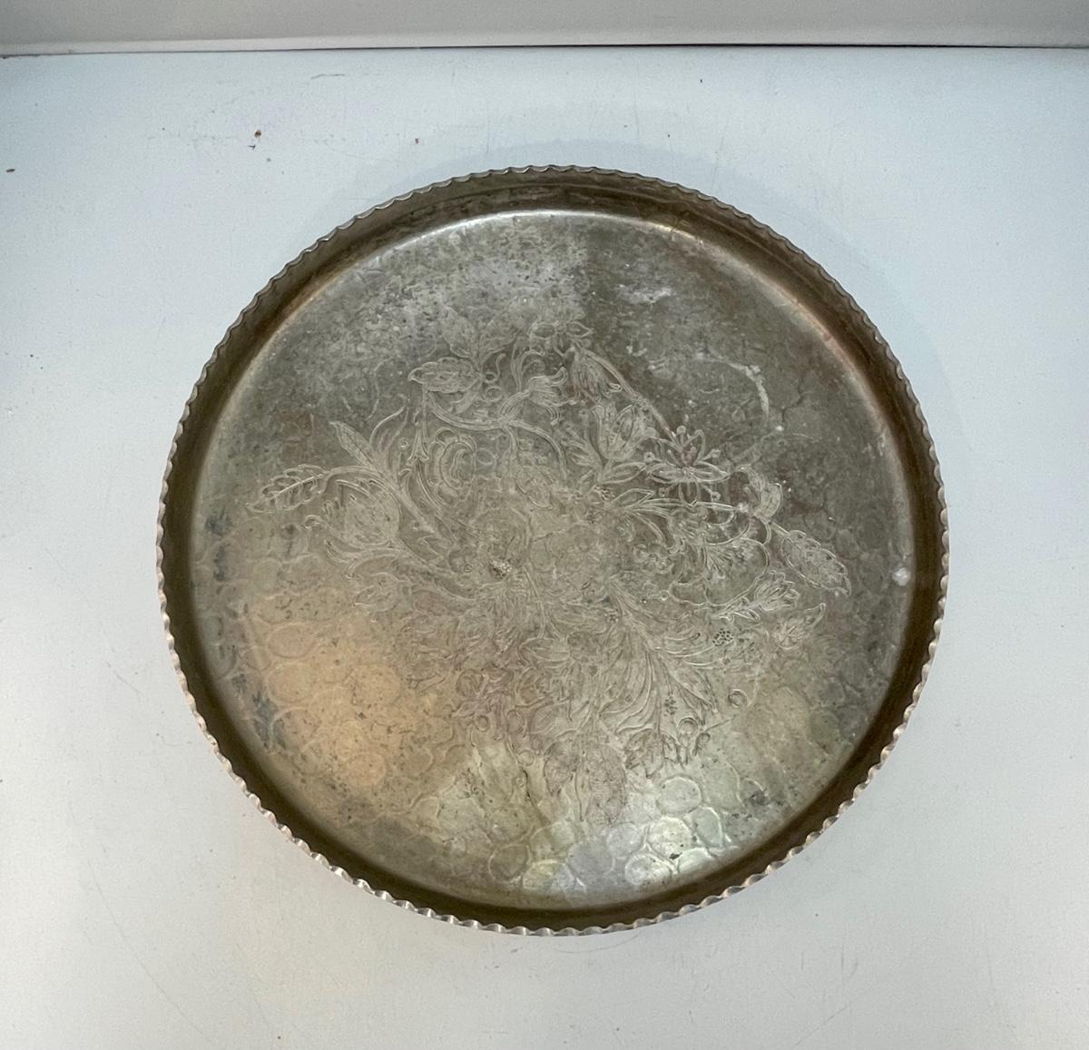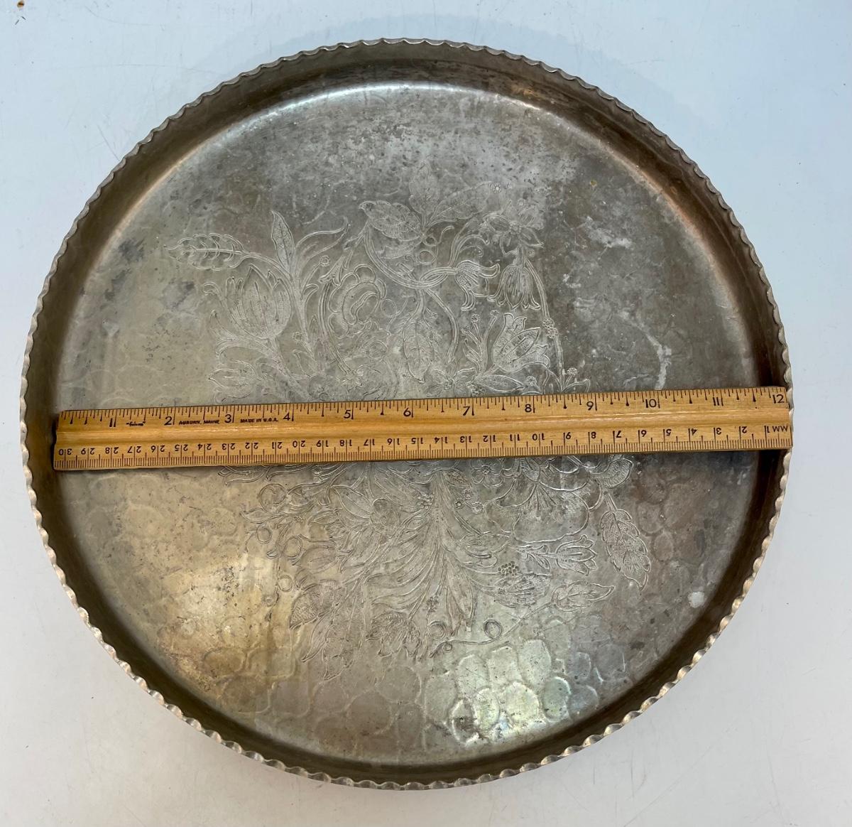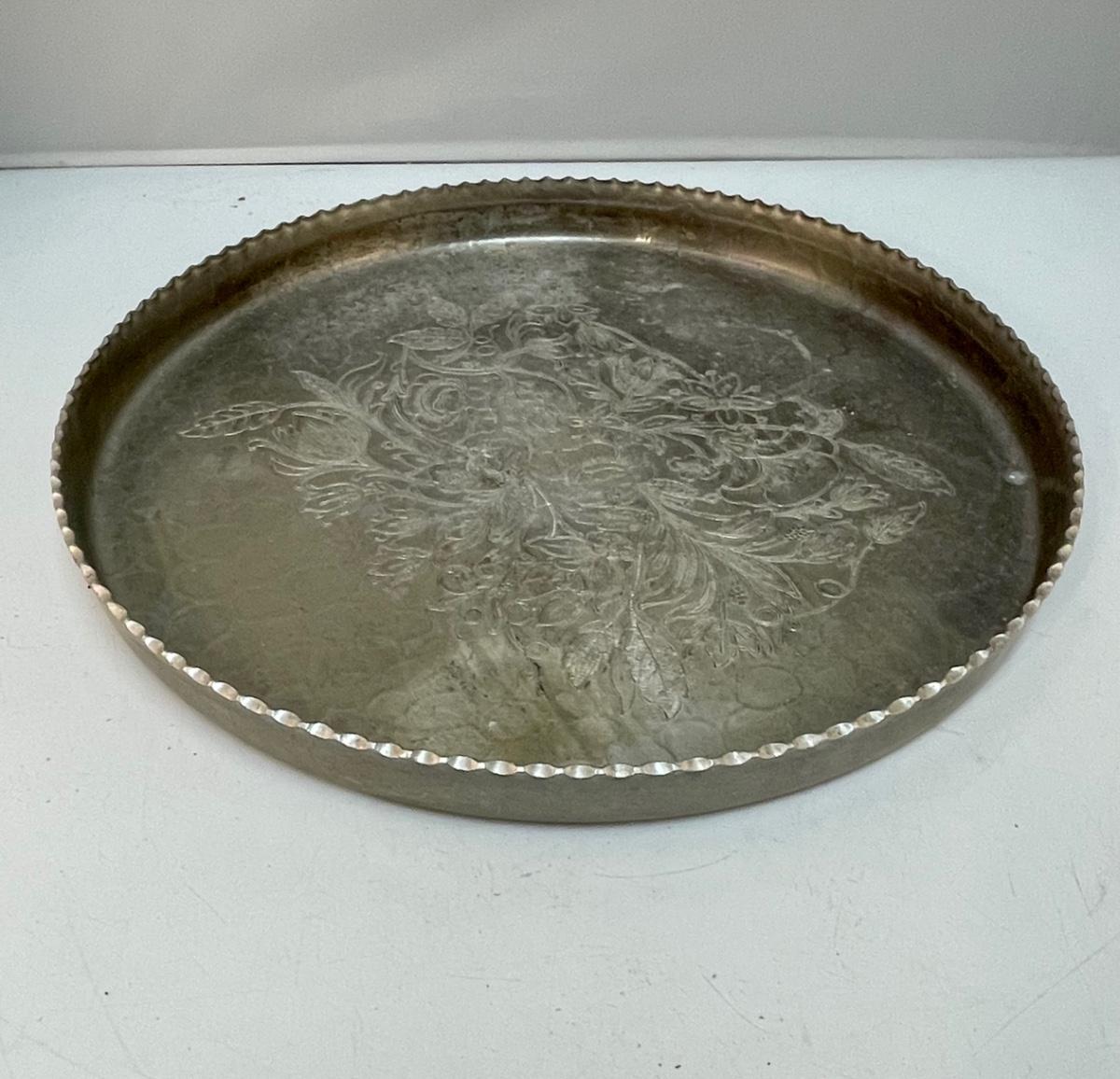 Vintage Hand Wrought Stamped Floral Pattern Aluminum Serving Tray. In used vintage condition. About 12" diameter.