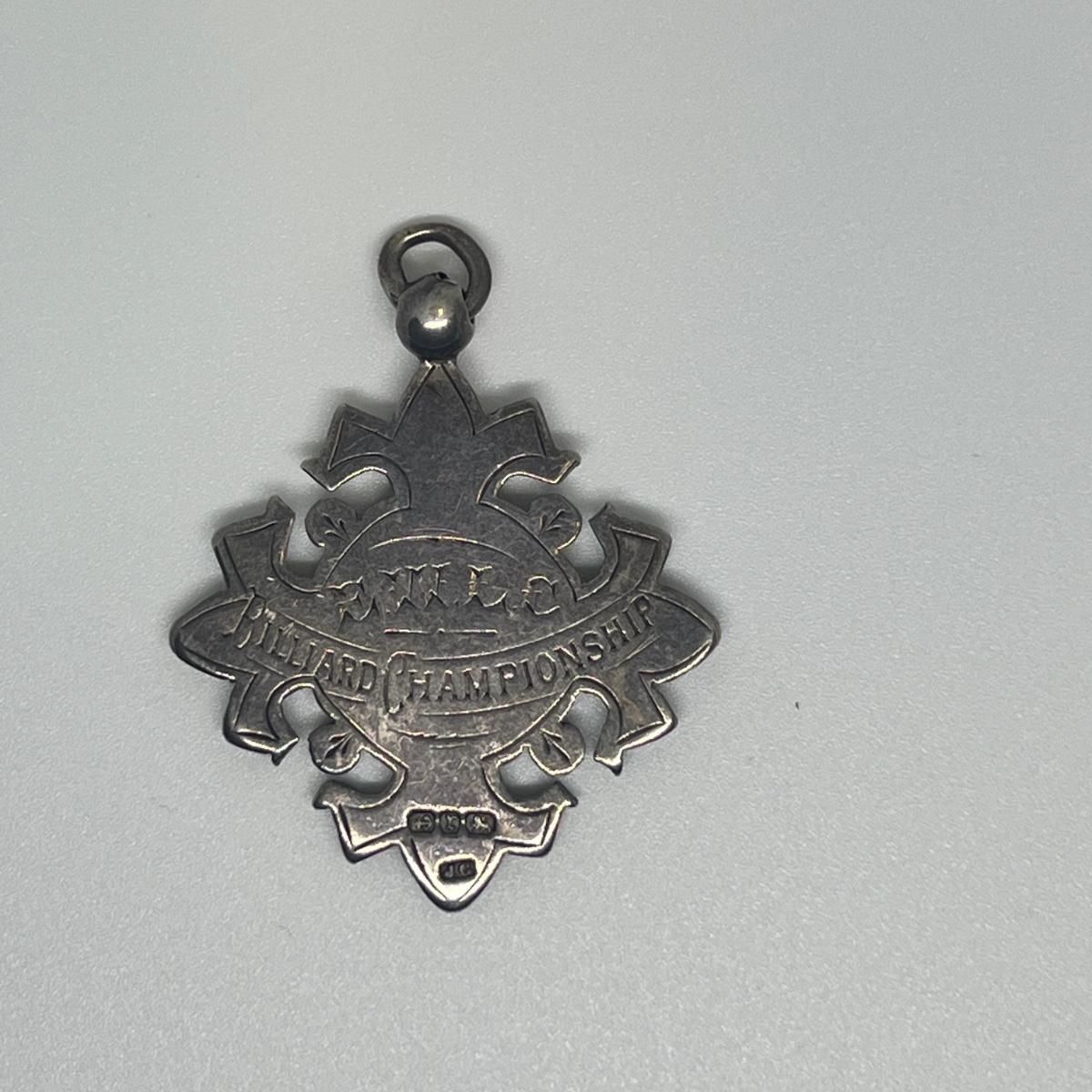 1.5" diameter believed to be a pocket watch fob engraved Billiard Championship sterling silver medal/medallion. Stamped J.G. with British sterling hallmarks. Weighs 19 grams.