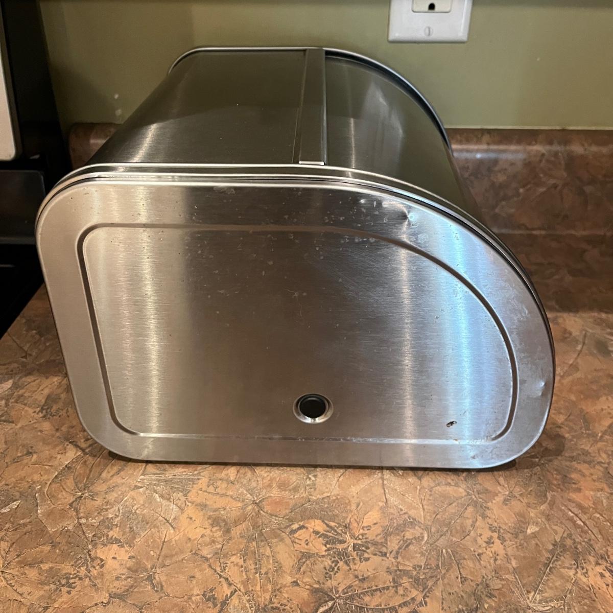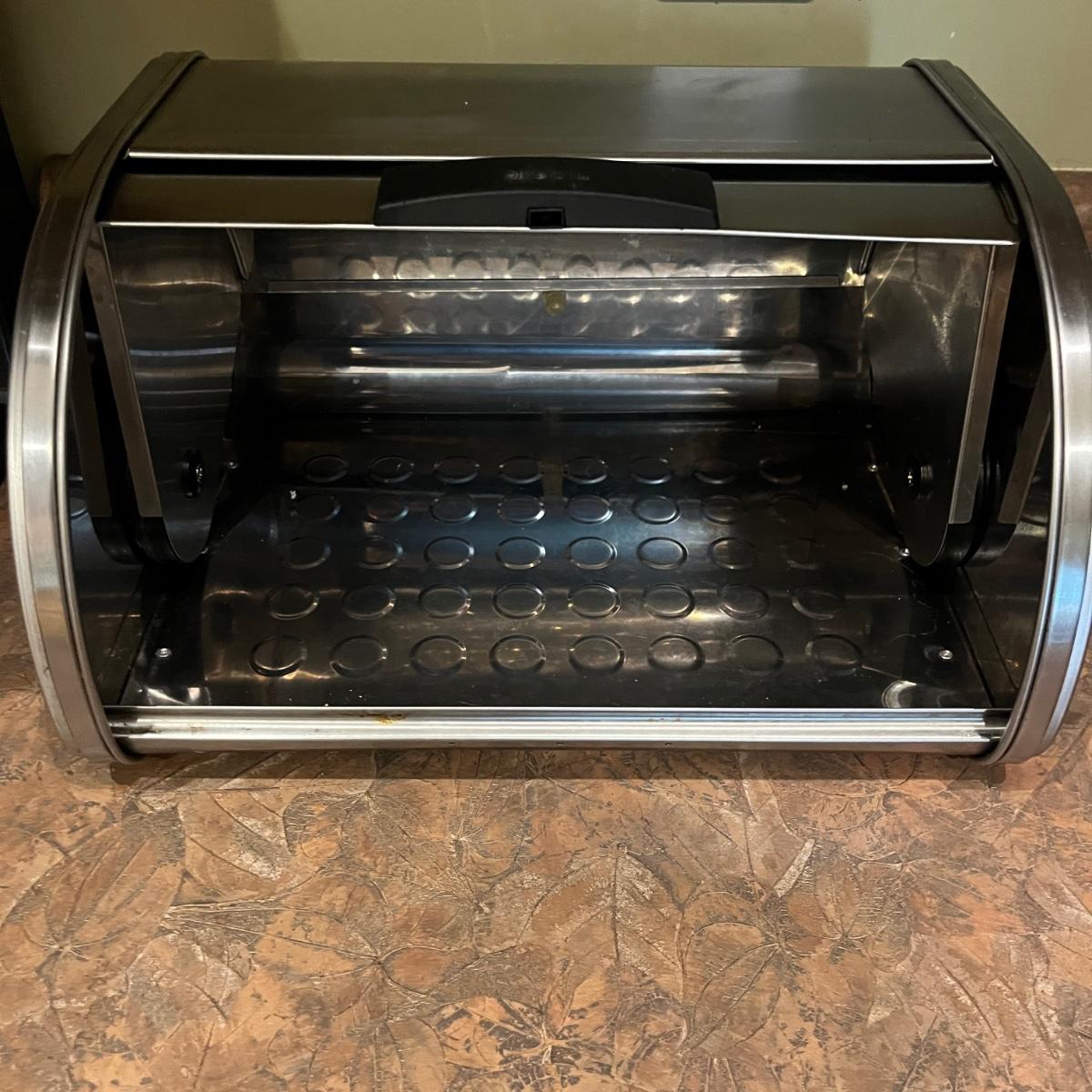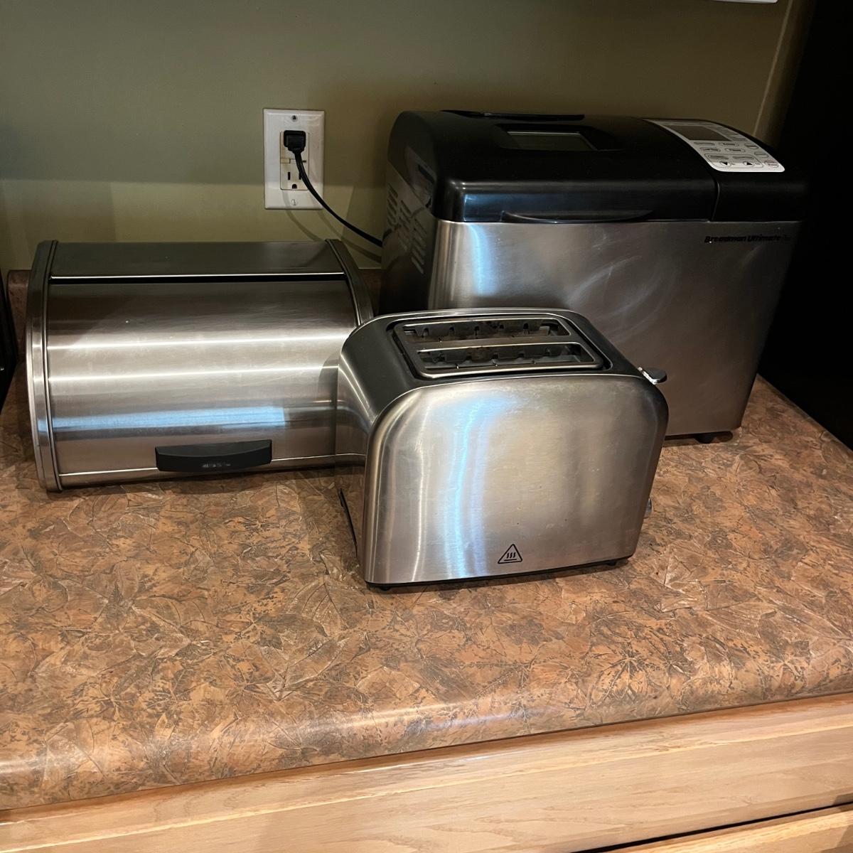 Lot includes a Xin Bao stainless steel toaster, Breadman Ultimate stainless steel bread maker and a stainless steel breadbox. Bread maker measures 15” x 9” x 12”H. Both electric items powered on when plugged in.