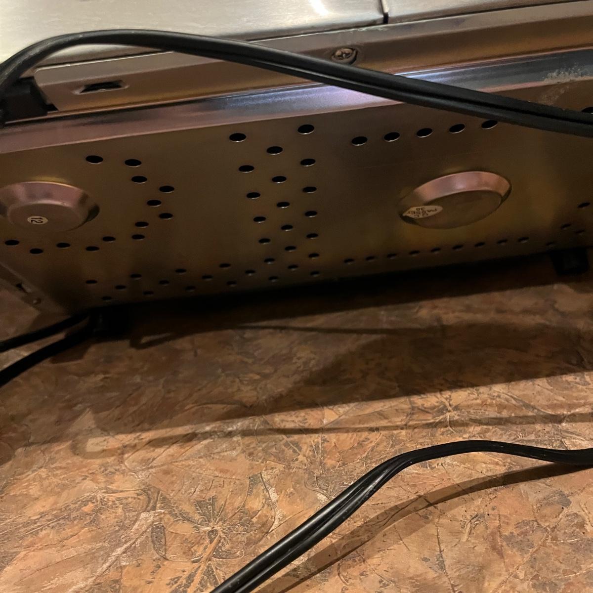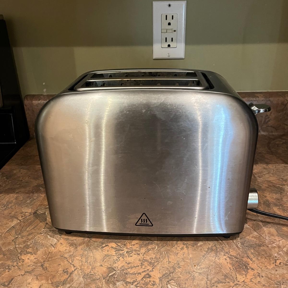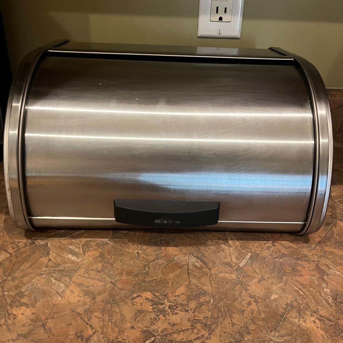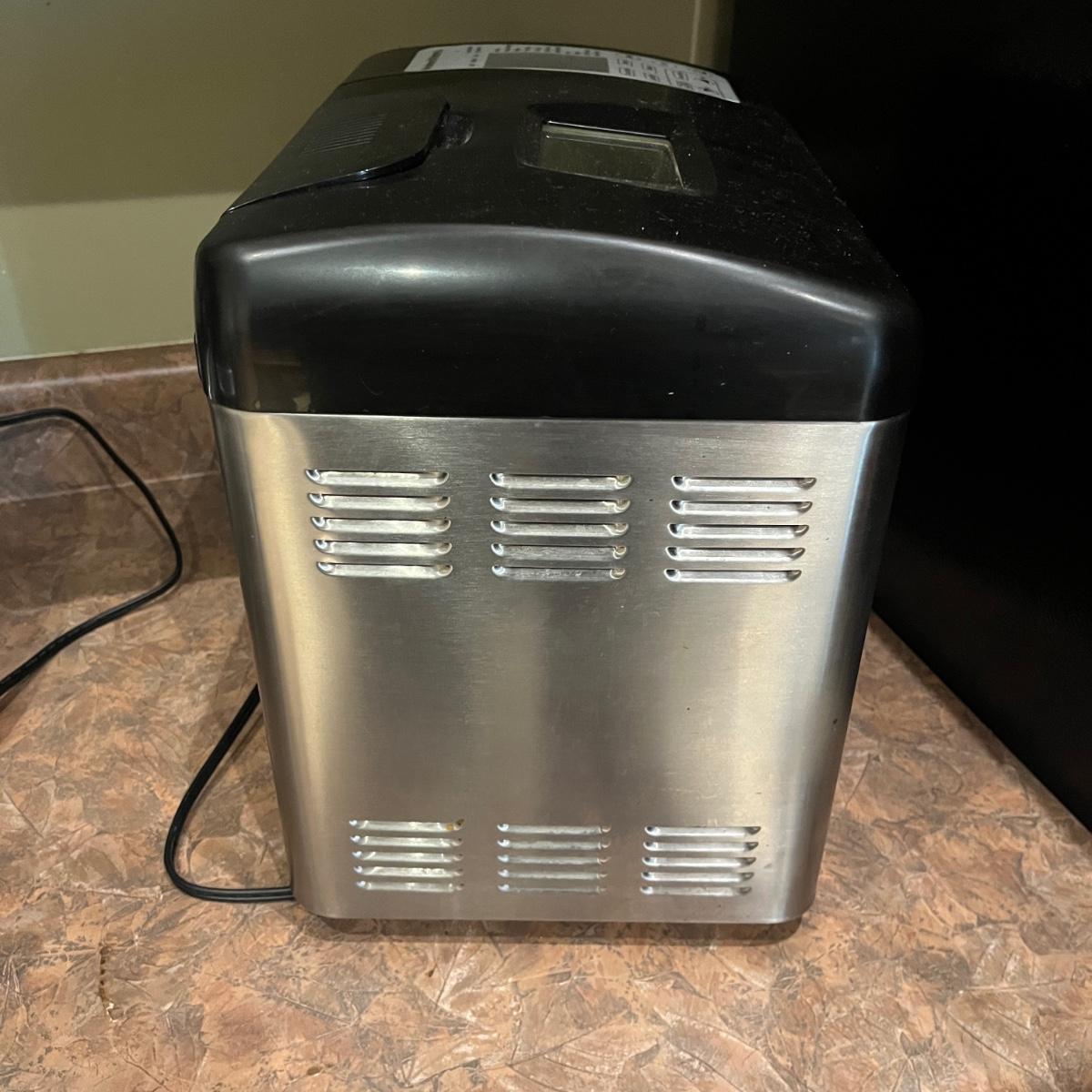 Lot includes a Xin Bao stainless steel toaster, Breadman Ultimate stainless steel bread maker and a stainless steel breadbox. Bread maker measures 15” x 9” x 12”H. Both electric items powered on when plugged in.