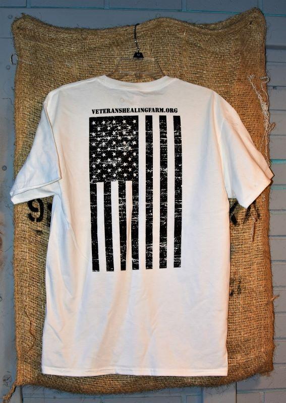Bright White Veterans Healing Farm T-Shirts These Hanes Tagless T-shirts are made of 100% pre-shrunk cotton. The VHF Tractor Logo is depicted in black on the front face and a modern US Flag is on the back. Wear this to show your support of not only the Veterans Healing Farm but all US Veterans living and those lost. These shirts are long-wearing and comfortable for both men and women.
