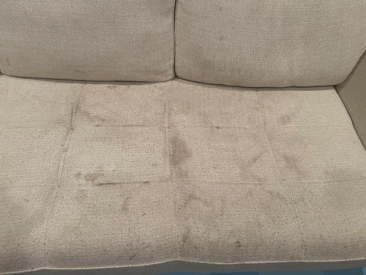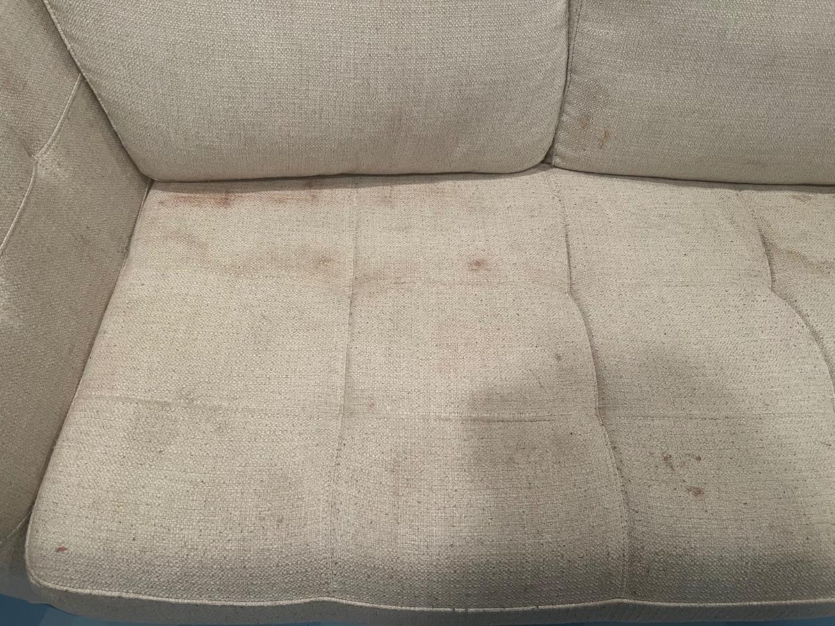 Stained. Includes two blue throw pillows.