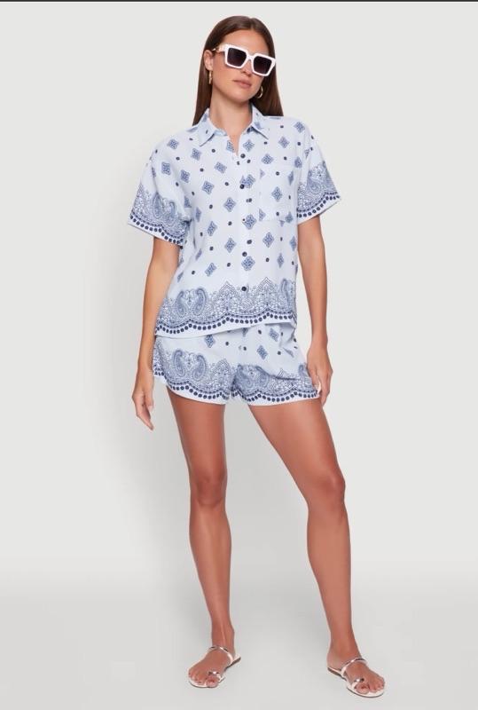 XL Two Piece Set Crepe Knit Bandana Print Shirt/Shorts - Blue