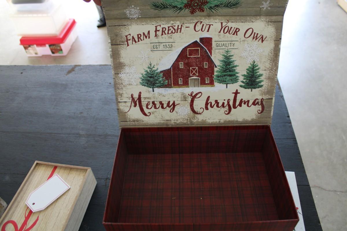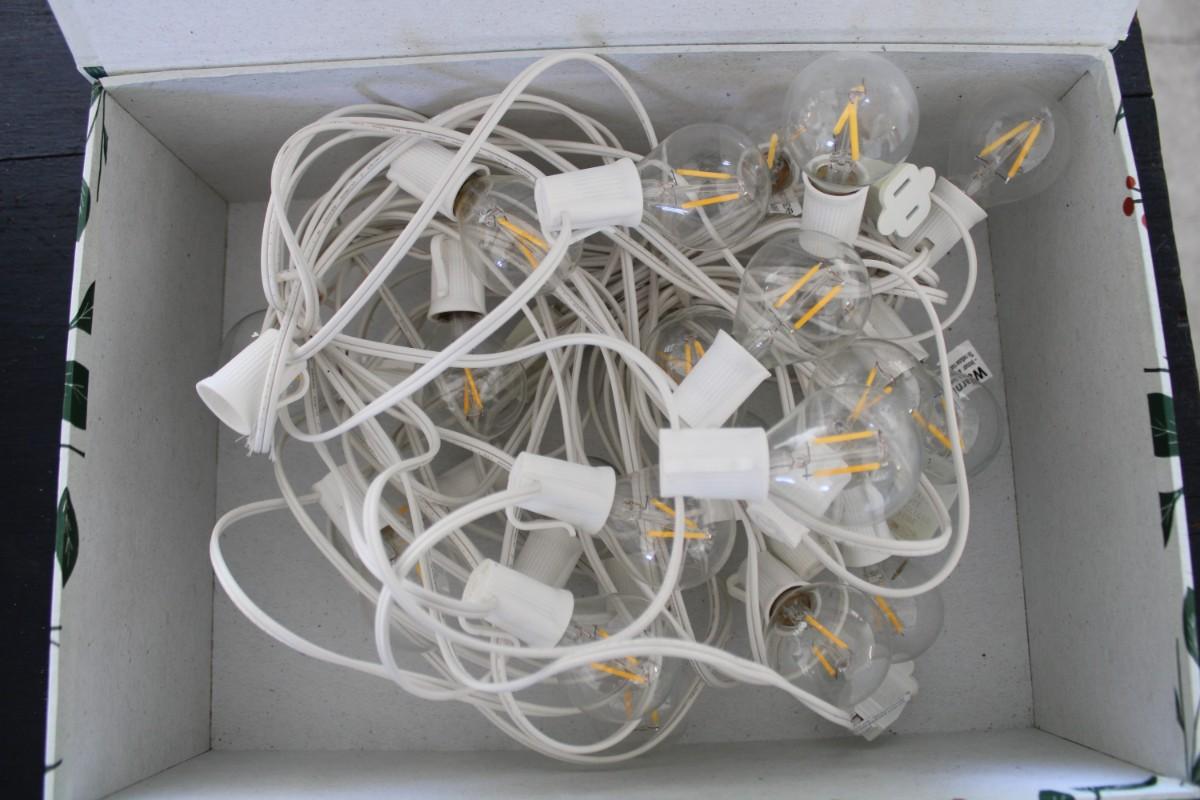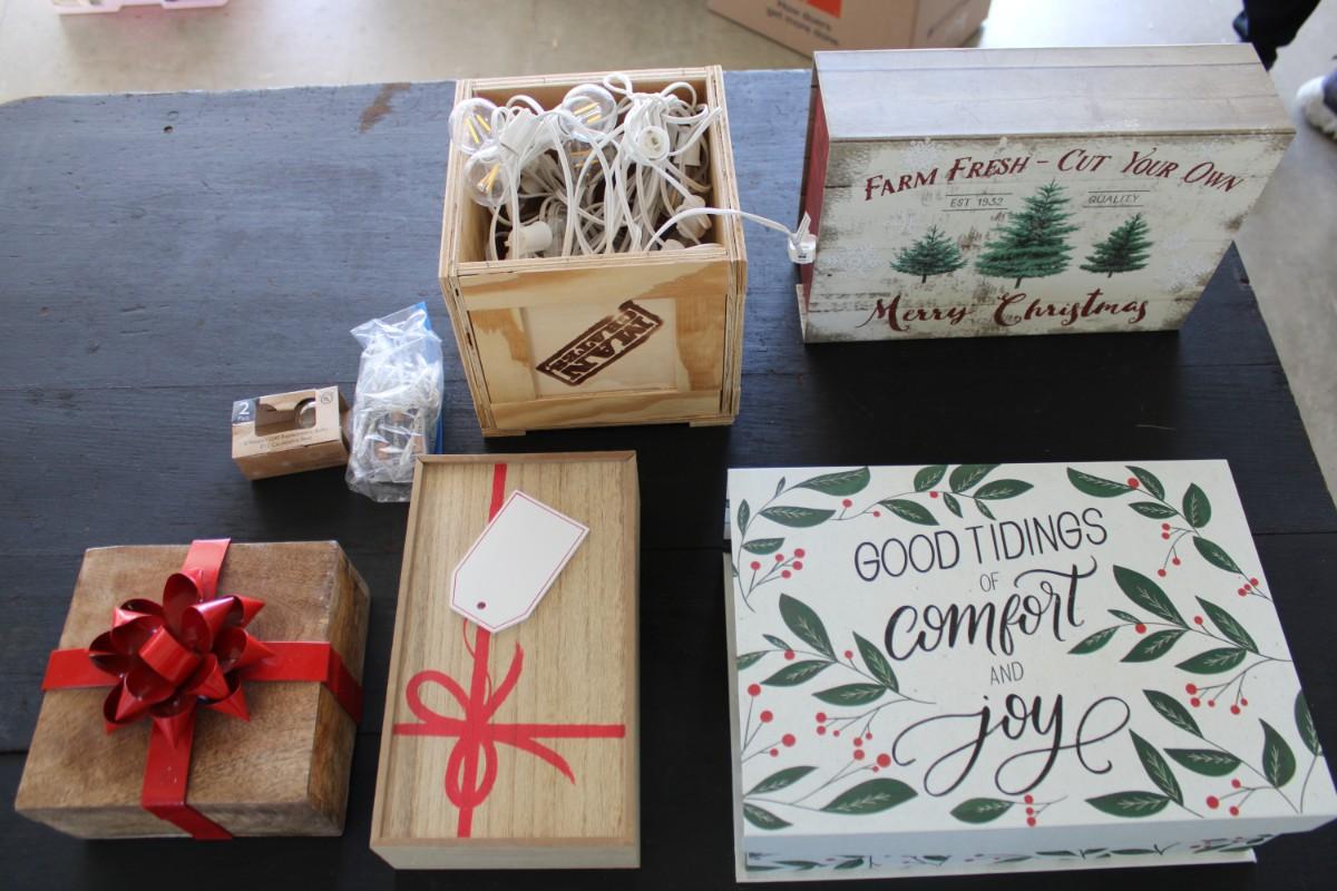 Christmas Holiday Décor Boxes and a Strand of Large White Lights