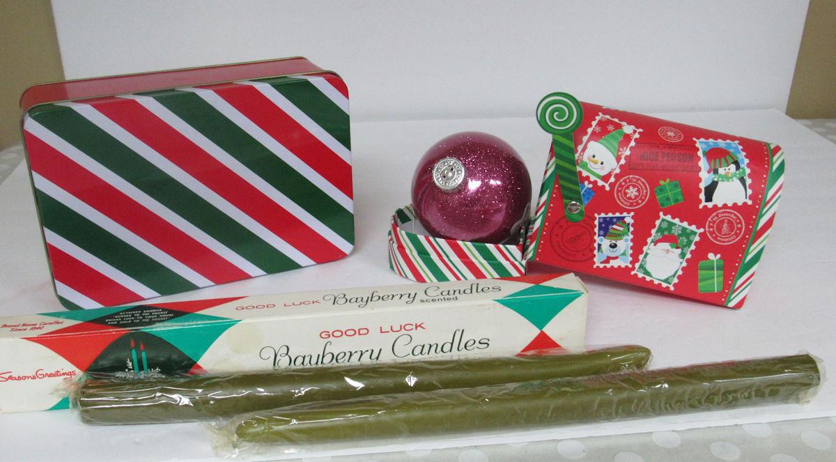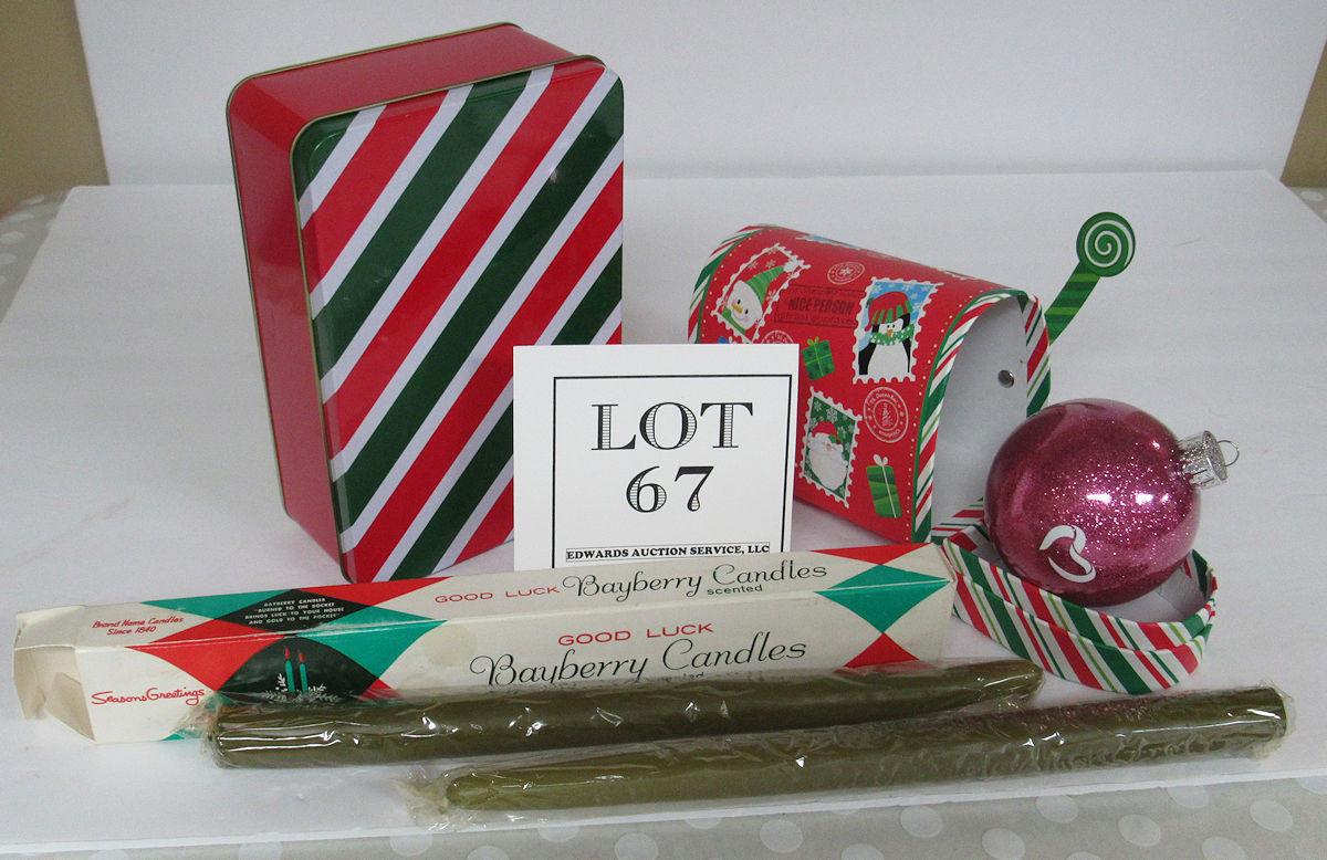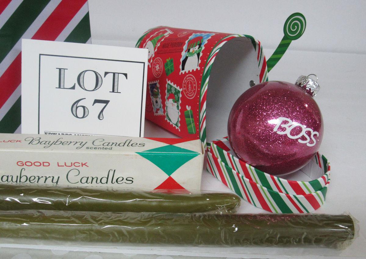 Xmas Lot #1 Unused BayBerry Taper Candles, Pink Boss Glass Ornament, More