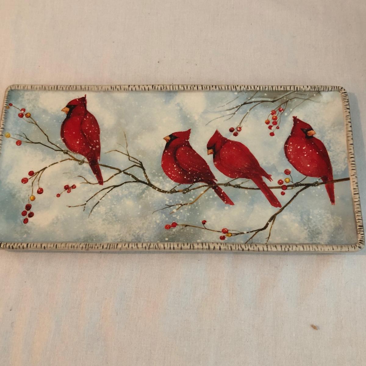 This lot has red and green table cloths, placemats, hand towels and dish ware for entertaining over the holidays! Dishware includes two boxes of dessert plates, six small round dishes, two spoon rests, a gold and green dish, a peppermint candy dish, eight red and white star shaped bowls, a cardinal ceramic tray and more. The multi-designed placemats (6) appear to be handmade and have a lovely weight to them. There are five table cloths. The cardinal platter is ceramic and measures 14.5” x 7”. The Juan Vela silver serving tray is metal and measures 12.5” in diameter and is 2” tall. Shipping Available.