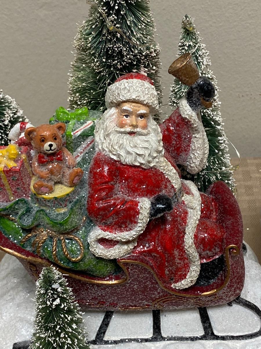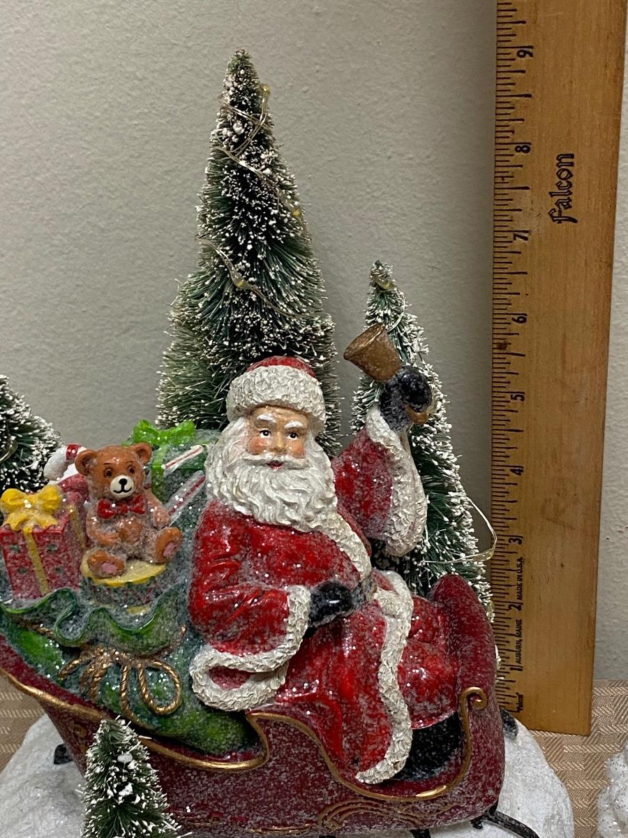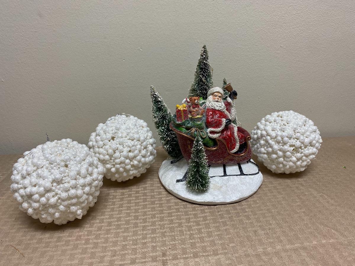 Light Up Santa Claus St Nick Figurine & Snowball Hanging Ornaments. Santa needs batteries, looks like there is small lights on the trees. All items in good condition.