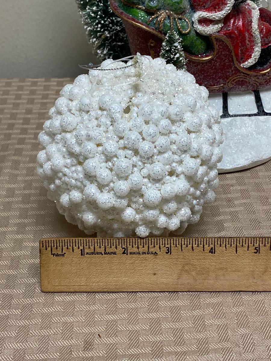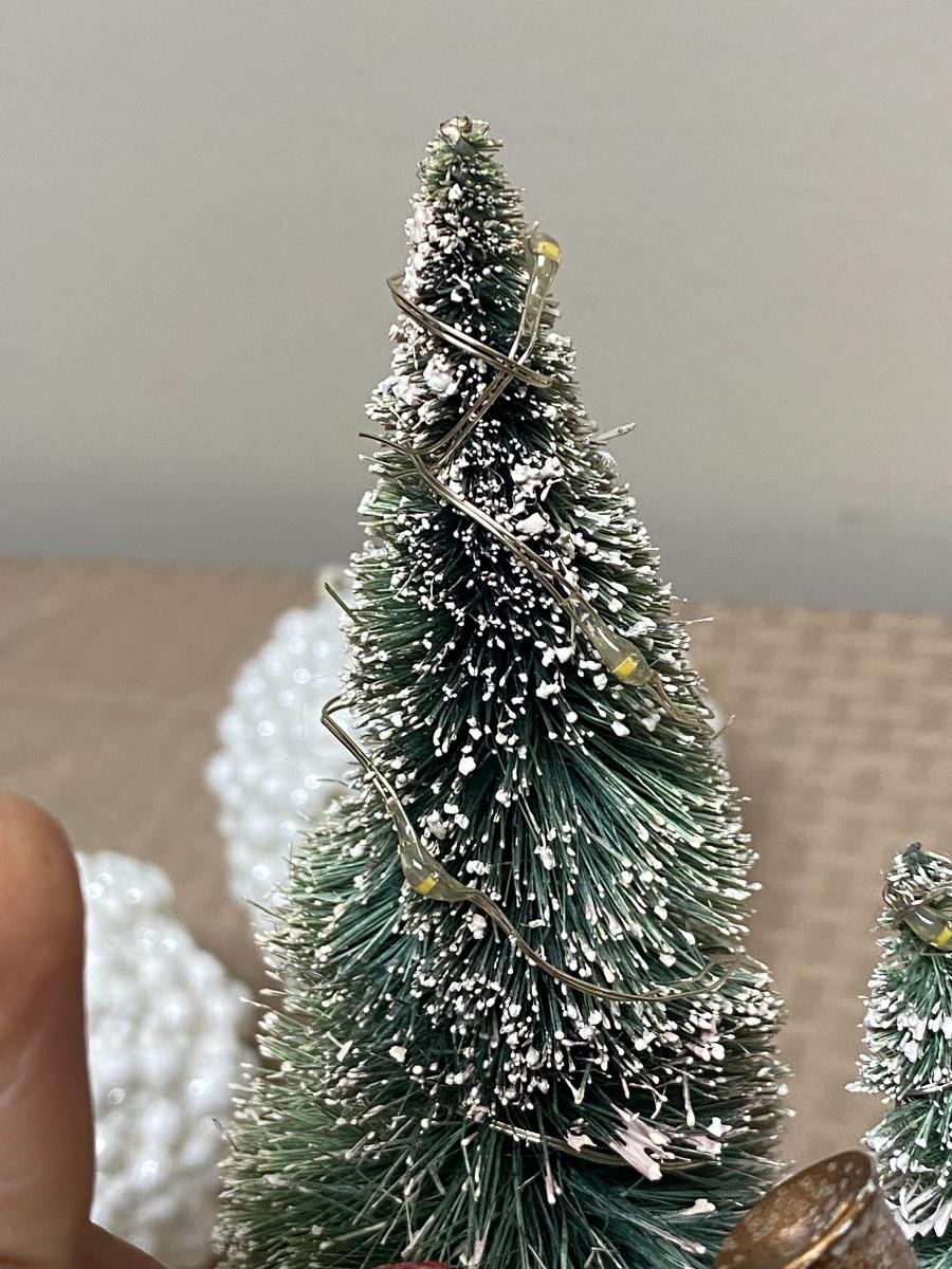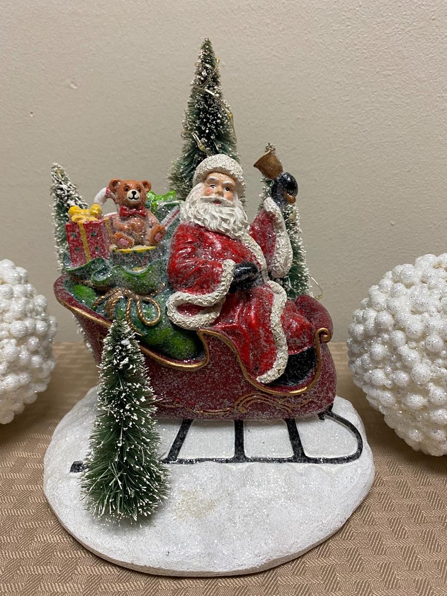 Light Up Santa Claus St Nick Figurine & Snowball Hanging Ornaments. Santa needs batteries, looks like there is small lights on the trees. All items in good condition.
