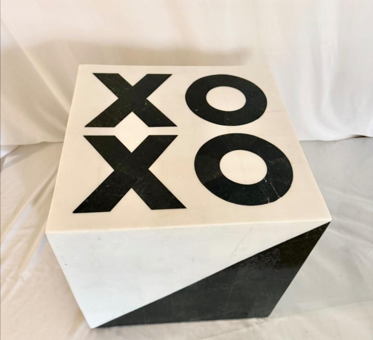 This XOXO table appears to be natural stone over a fiberglass form by Gold Leaf Designs. Table measures 16.5” x 16.5” x 16.5”H.
