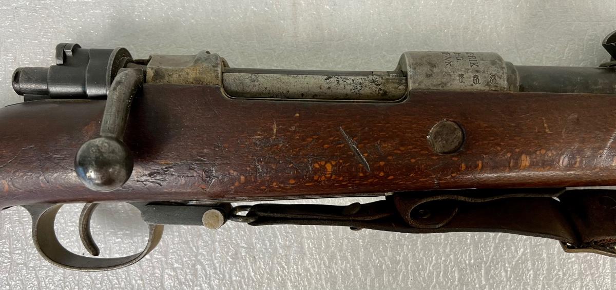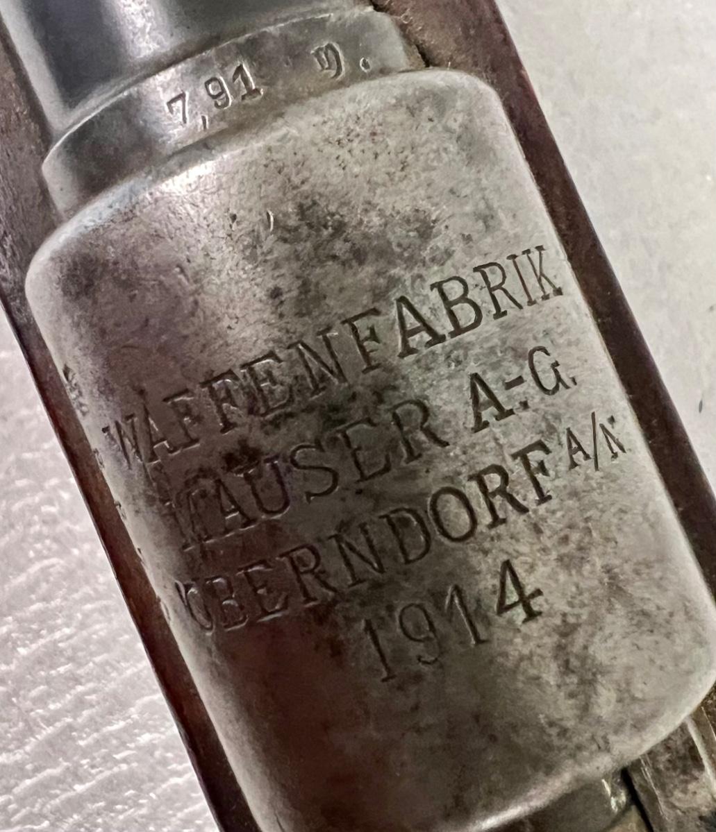 Stamped Waffenfabrik, Mauser A-G, Oberndorf, 1914. Caliber is 8mm mauser. Mismatched bolt. Serial number 8870. Not tested. SOLD AS IS.