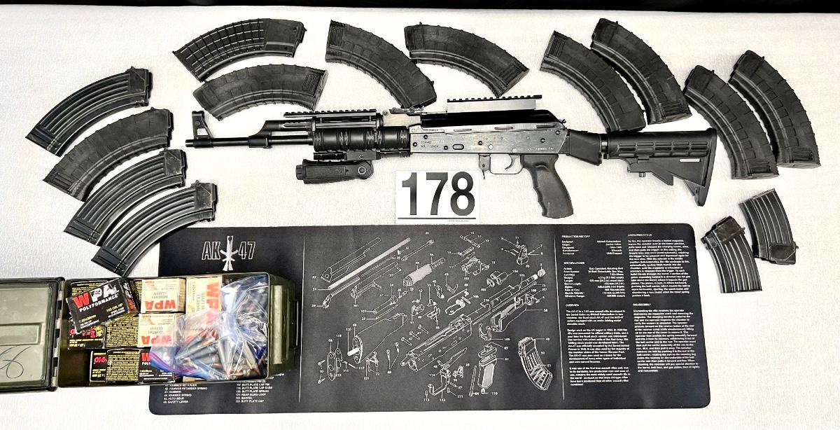 [J] Caliber is 7.62x39. Lot also includes 14 magazines, 773 rounds of ammo, cleaning mat, and an ammo can (not pictured). Serial number 61987. Accessories and ammunition can be picked up during pickup hours at the studio; gun will be picked up at FFL transfer