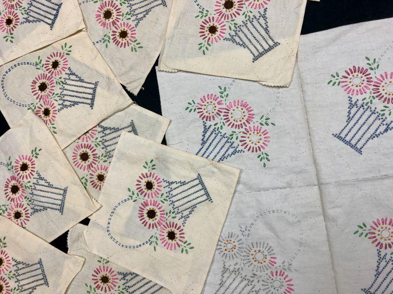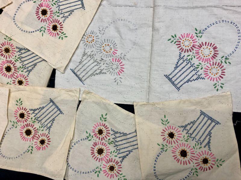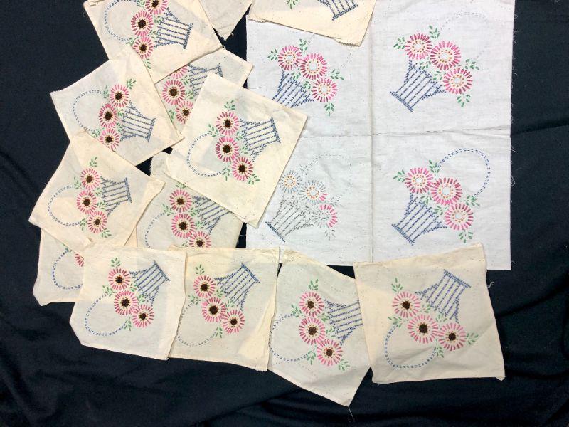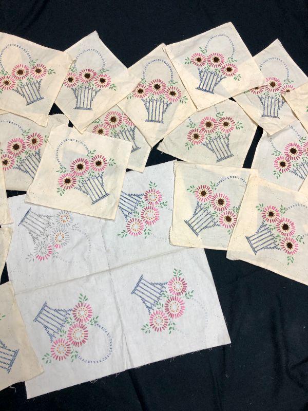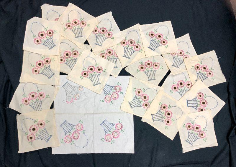 19 hand stitched floral squares and a set of 4 incomplete squares. Could be used for different sewing projects. Linen is slightly discolored from age and storage. Measure about 9" square unfinished.