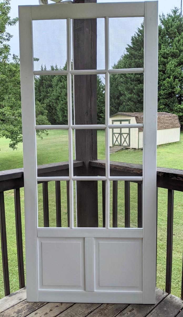 From Screen Tight website: Wedgefield screen door features full-view top screen to maximize outside visibility and natural sunlight to brighten your home. Constructed of strong and durable solid vinyl to protect against rust, corrosion, fading or splitting. White UV-protected vinyl prevents fading or discoloration with age; no painting required