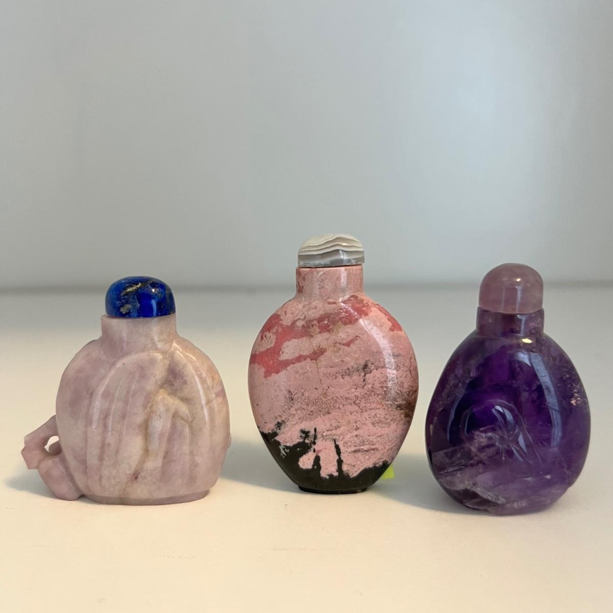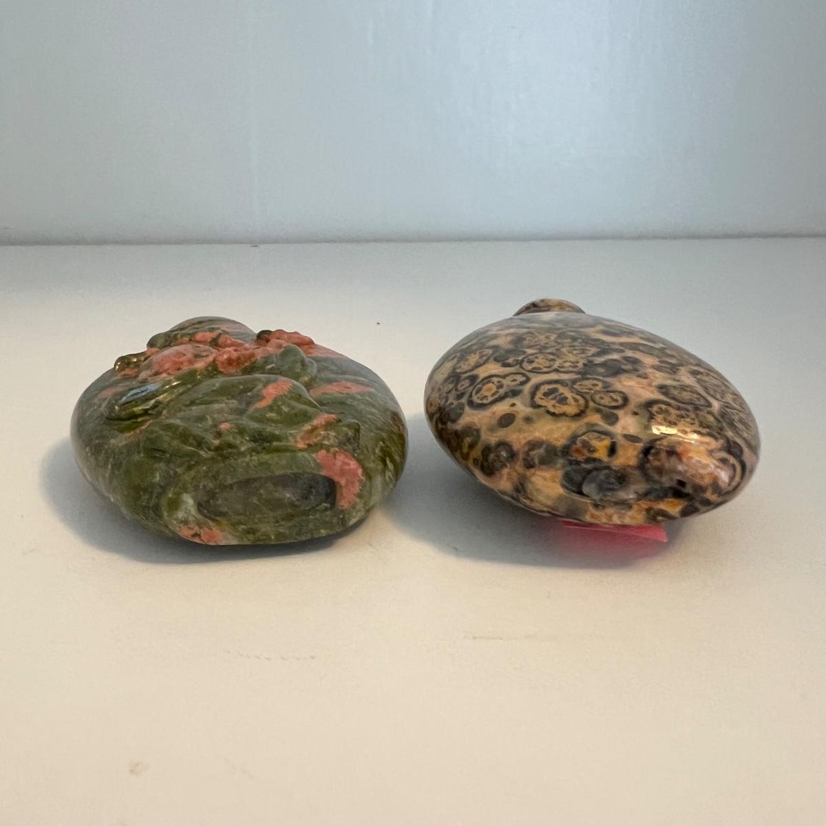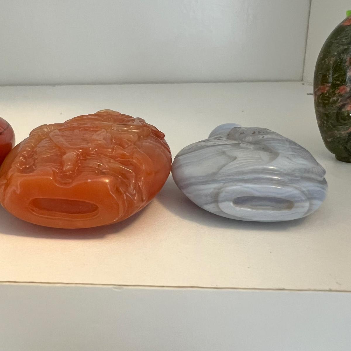 All of these snuff bottles come with a stopper. Each one is unique with wonderful veins of colors. Includes what appears to be rhodonite, tigers eye, malachite, jasper, lapis and more. Some of them have carved fronts such as the pink rhodonite with a rabbit and the pale pink lapis that features a horse. This lapis bottle is one of the smaller ones and measures 2” x 0.5” x 2.25”h.