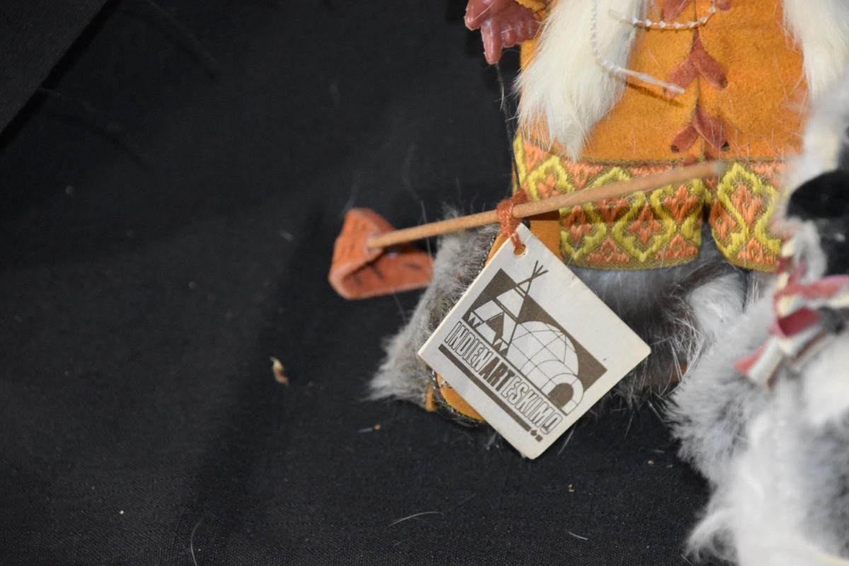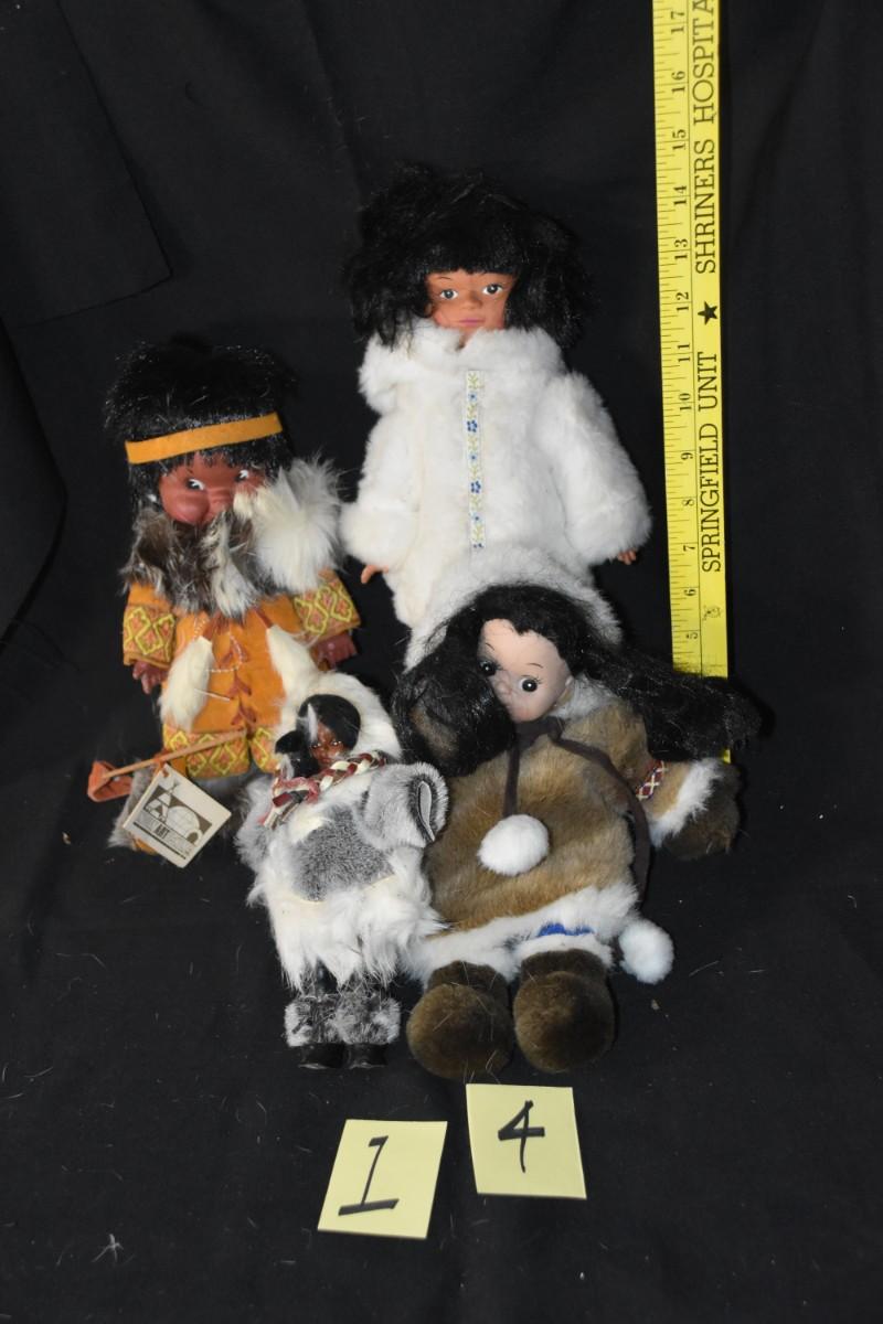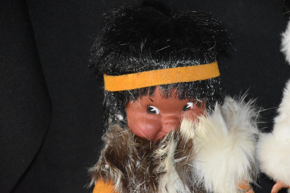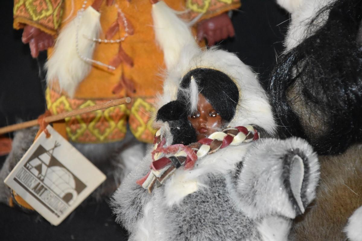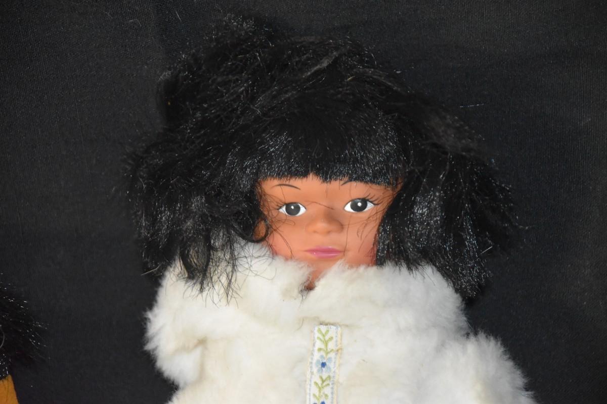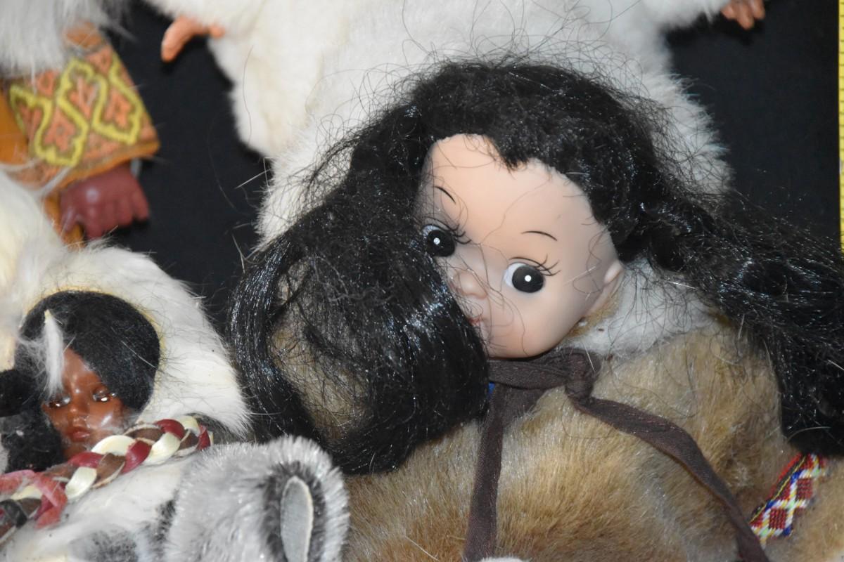 "Eskimo" dolls in furs, some which appear to be real. One is an official doll from Native Eskimos.