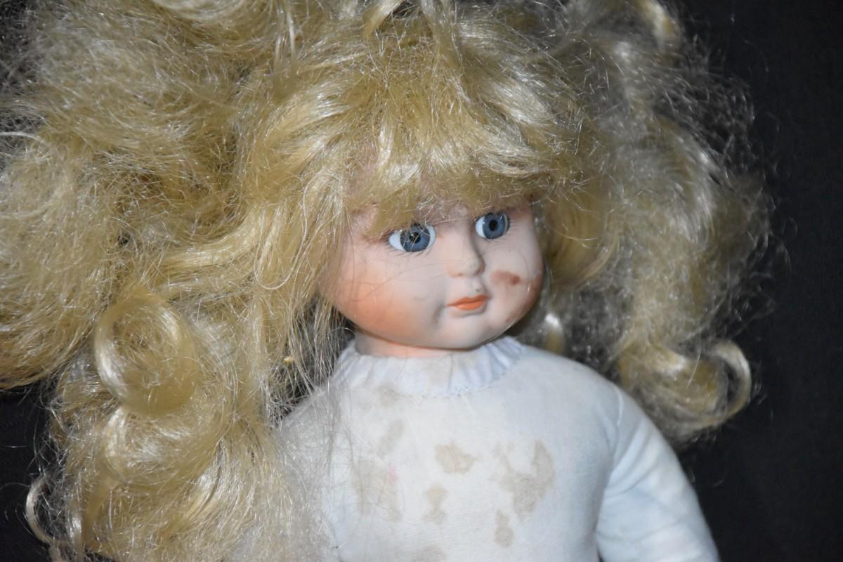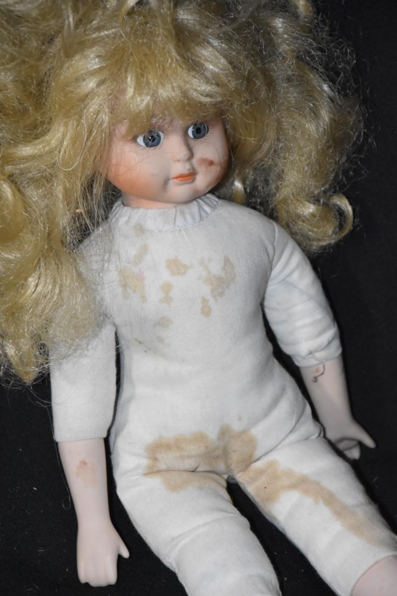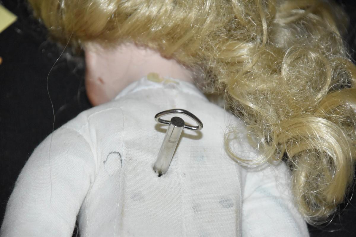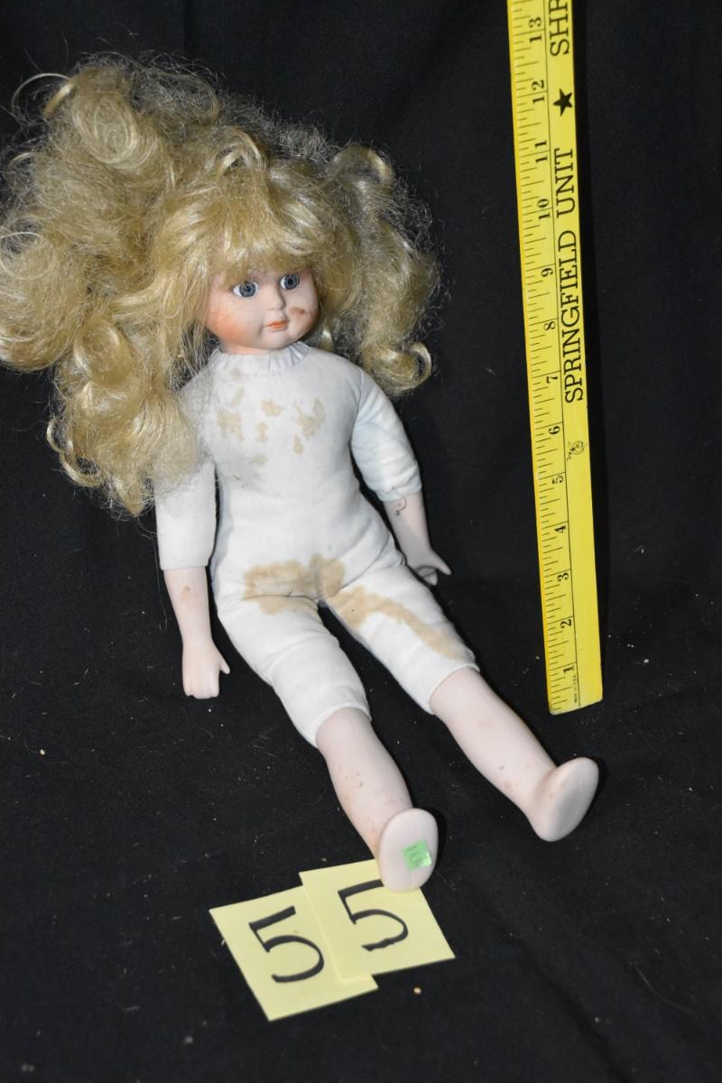 Older doll, bisque head, stains on body, no clothes, soft body. Bisque hands and feet. wind up key, works.