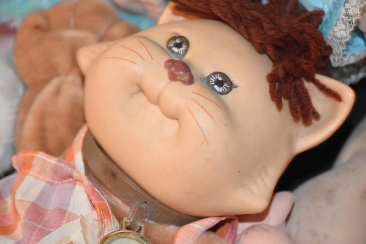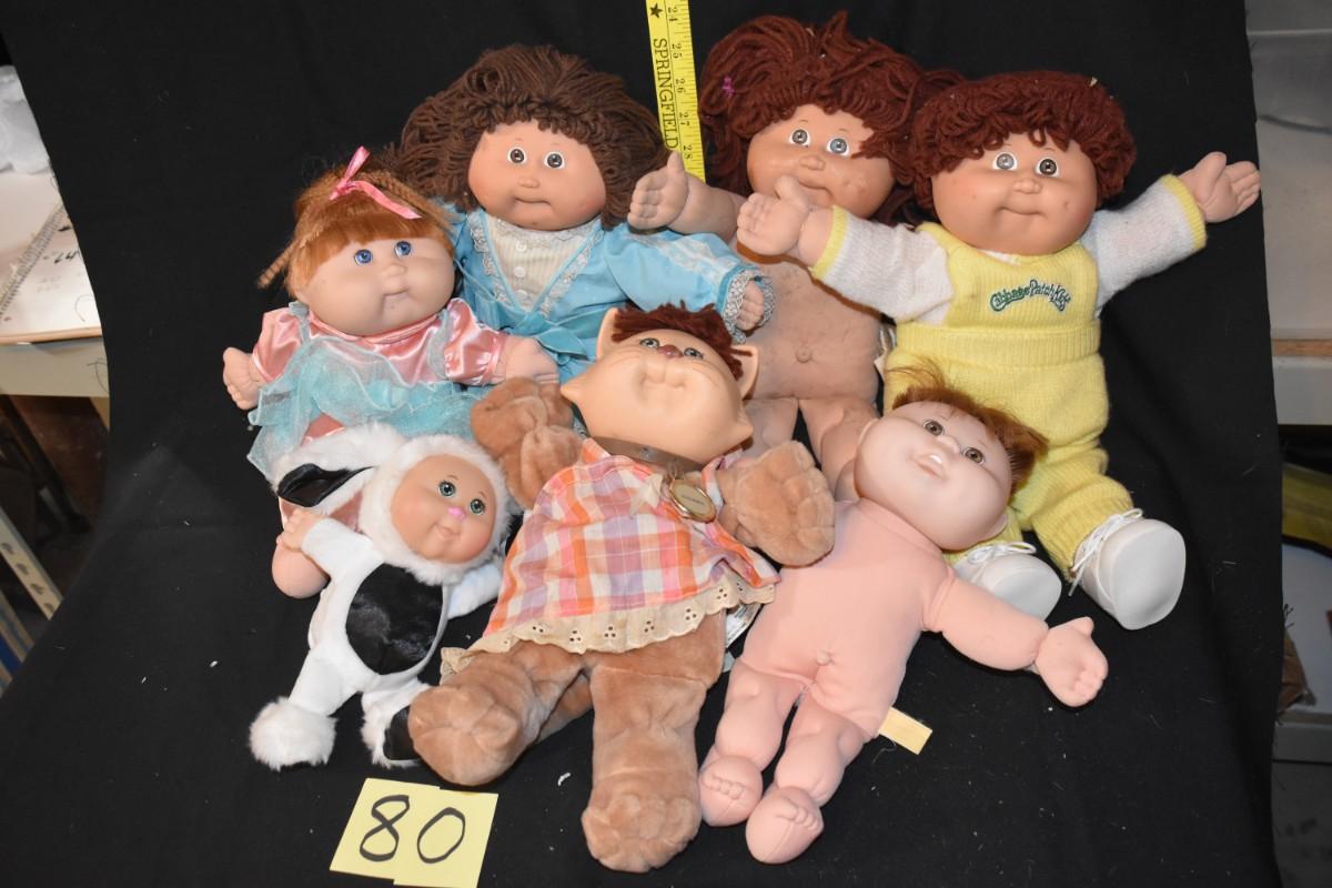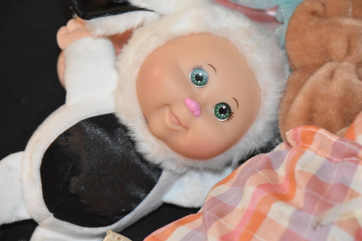 Seven Cabbage Patch dolls, including a cat doll and a baby doll in a c ow costume.