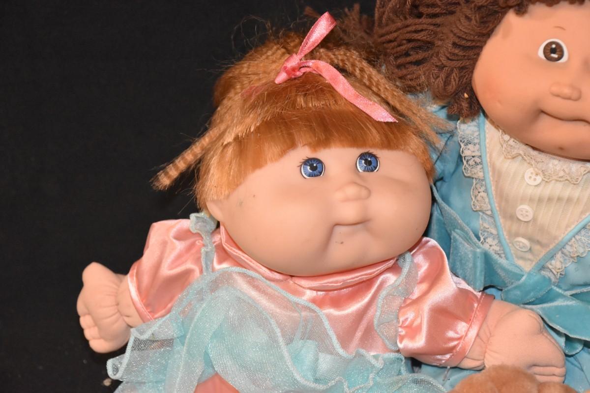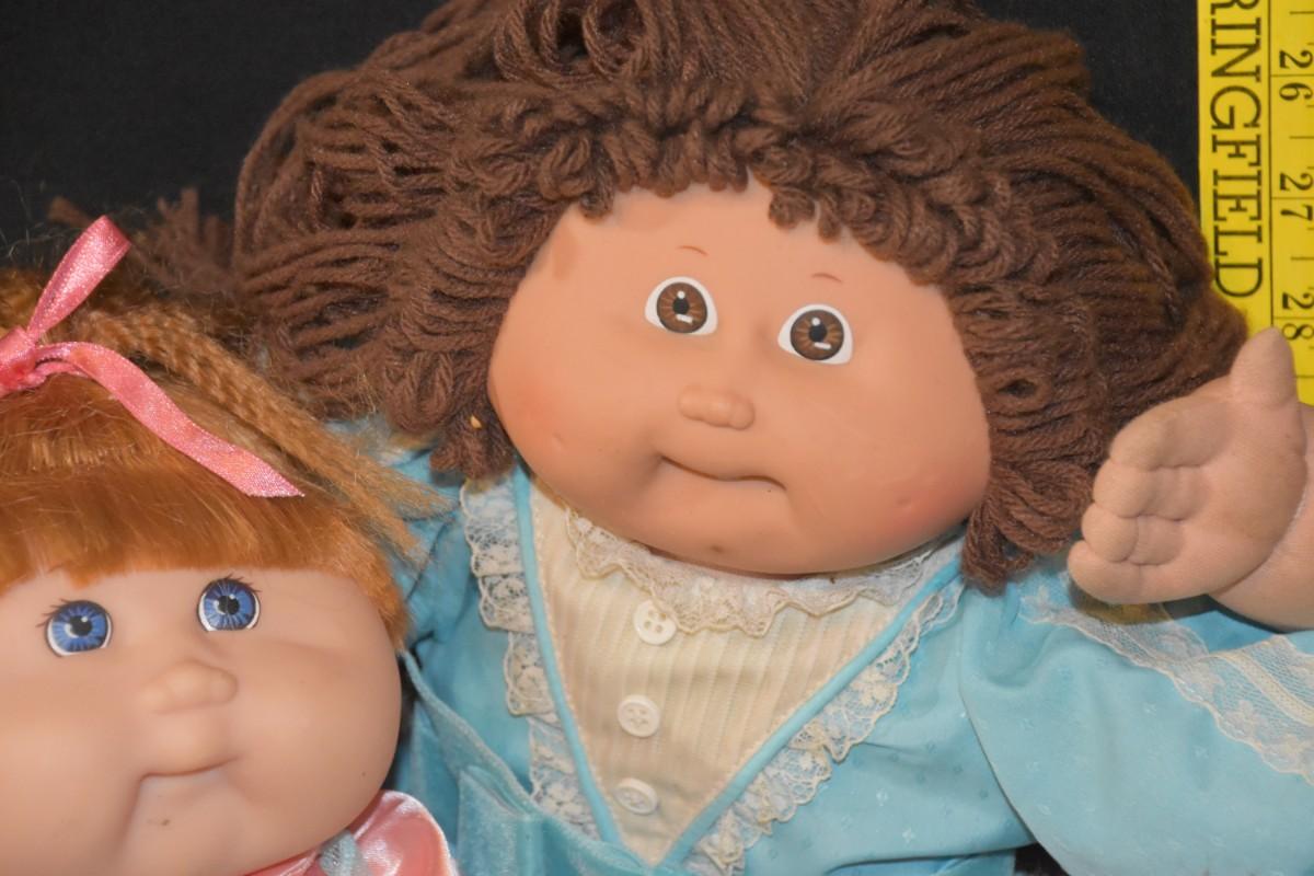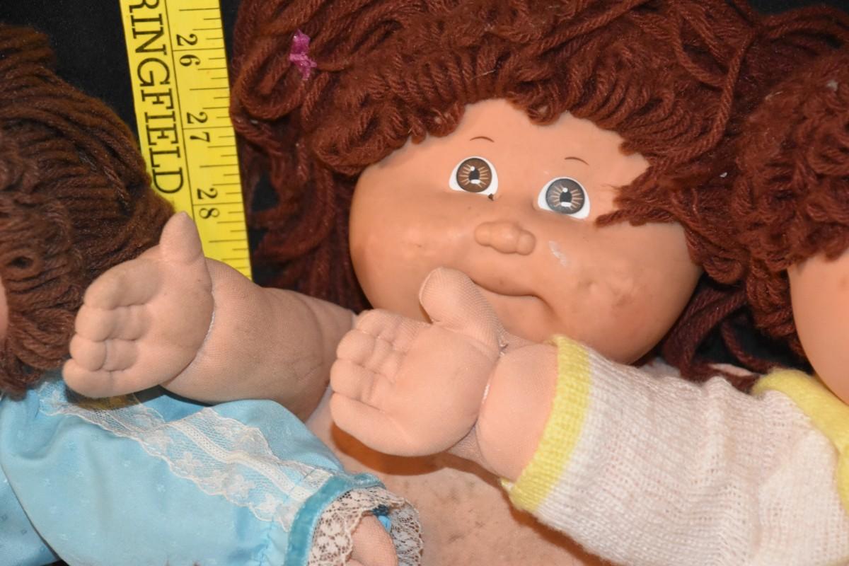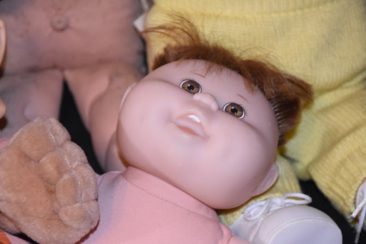 Seven Cabbage Patch dolls, including a cat doll and a baby doll in a c ow costume.