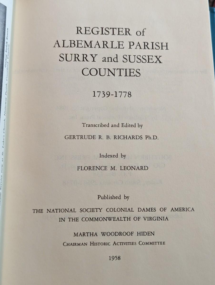 Register of Albemarle Parish, Surry and Sussex Counties 1739-1778 HC book