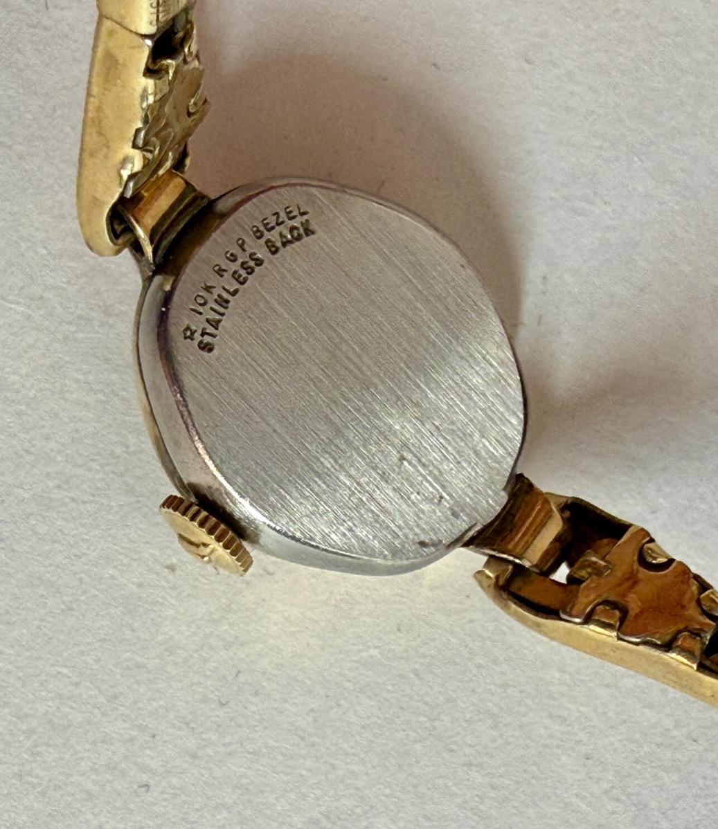Manual wind, in running condition. With a stretch-style band. Round white watch dial. Swiss-made, 10K Rolled Gold Plate Bezel.