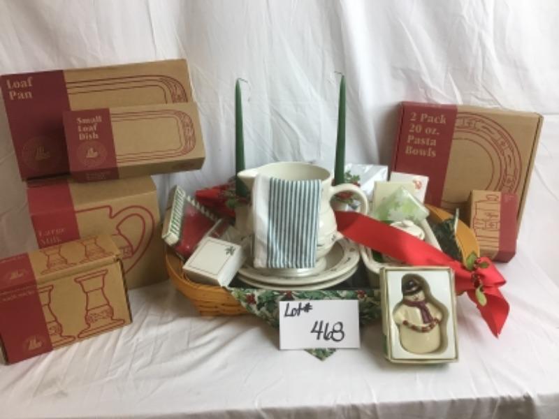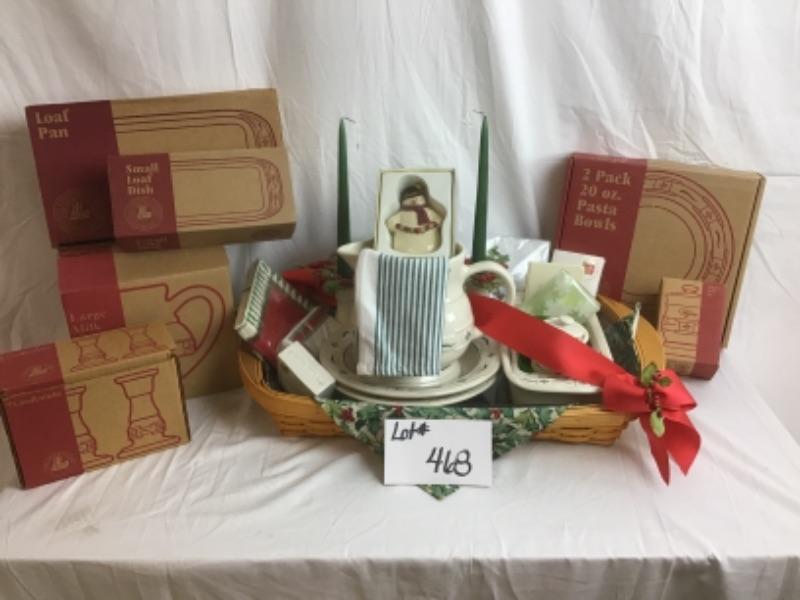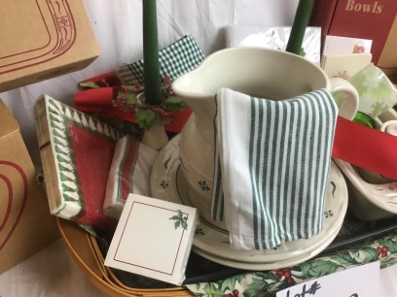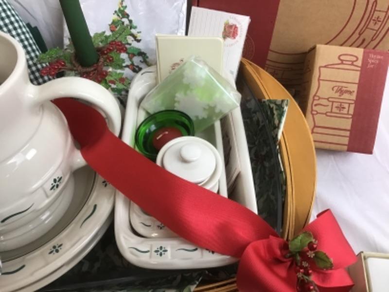 Longaberger serving gift basket included large milk pitcher, 5 inch candle sticks, small loaf dish, medium size loaf pan, two pack 20 ounce pasta bowls, thyme spice jar, Tae Towel, Ornaments Basket includes plastic and fabric liner