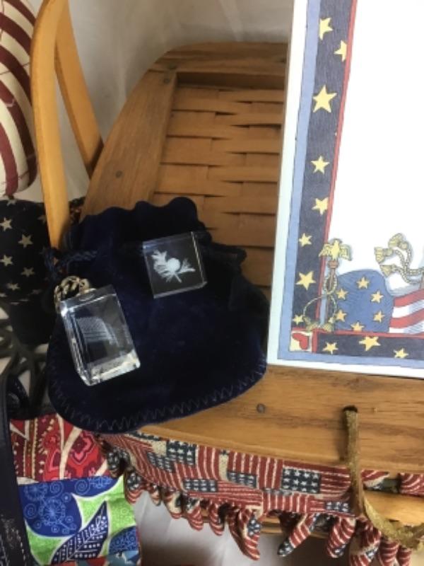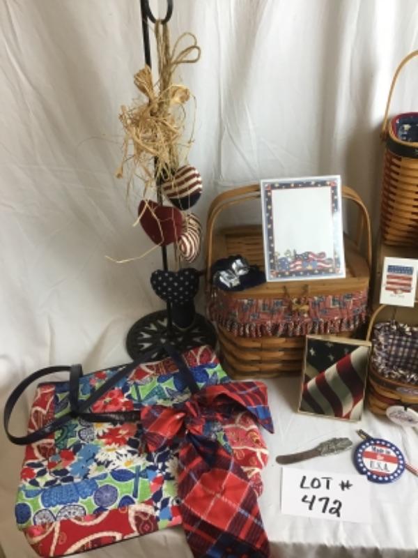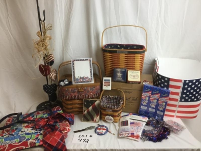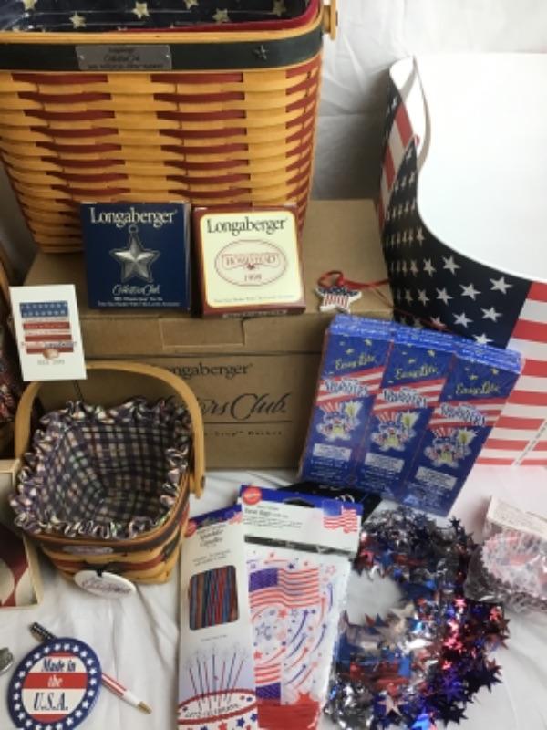 Longaberger celebration basket gift- one basket has two handles, l fabric and plastic liners, a small one handle basket with fabric and plastic liner and then Longaberger Collections club 2001 whistle stop basket with plastic liner fabric liner. Garland, sparklers, cupcake cups, pens, bag, star, cards, decorative hanging piece , rubber carry bag