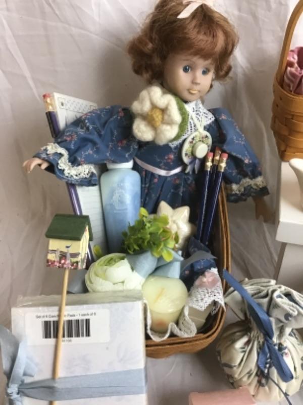 This doll baby Lot has 4 Longaberger baskets, beautiful baby doll, stationery, pencils candle, soap, notepads, tea towel, Tie-Ons