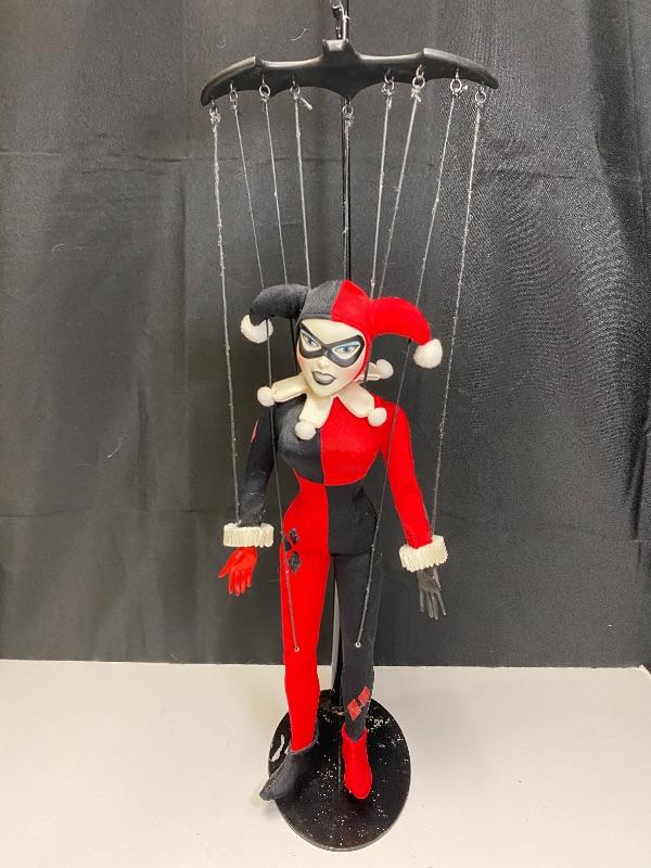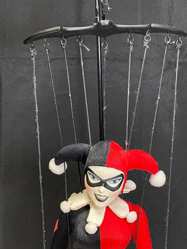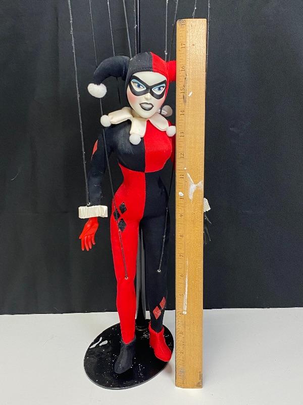 2004 DC Comics HARLEY QUINN porcelain marionette puppet from DC Direct. Limited edition #0317/1007. Comes with display stand. 16" puppet not including strings. Face and costume are in good condition. She was previously displayed and is a little dusty/ cobweb on strings. There is a white speckle on the base of stand and on the bat shaped handle, two specks on her hand also, not sure what it is from. Made in China. Marked on the bottoms of her feet. Do not have the box, papers, or accessories that she came with.